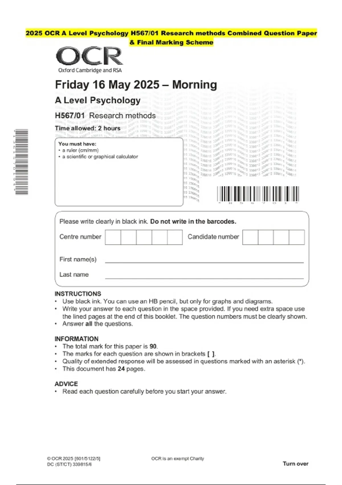 2025 OCR A Level Psychology H567/01 Research methods Combined Question Paper and Marking Scheme