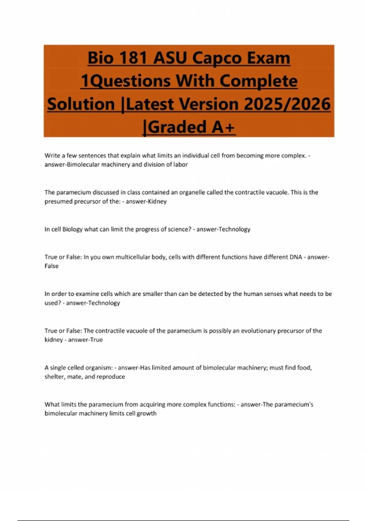 Bio 181 ASU Capco Exam 1Questions With Complete Solution |Latest Version 2025/2026 |Graded A+ Write a few sentences that explain what limits an individual cell from becoming more complex. - answer-Bimolecular machinery and division of labor The paramecium discussed in class contained an organelle called the contractile vacuole. This is the presumed precursor of the: - answer-Kidney In cell Biology what can limit the progress of science? - answer-Technology True or False: In you own multicellular body, cells with different functions have different DNA - answerFalse In order to examine cells which are smaller than can be detected by the human senses what needs to be used? - answer-Technology True or False: The contractile vacuole of the paramecium is possibly an evolutionary precursor of the kidney - answer-True A single celled organism: - answer-Has limited amount of bimolecular machinery; must find food, shelter, mate, and reproduce What limits the paramecium from acquiring more complex functions: - answer-The paramecium's bimolecular machinery limits cell growthTrue or False: In you own multicellular body, different cells in your body have a division of labor between them - answer-True Compared to bacteria which of the cell below are not responsible for finding food: - answerLymphocyte, Macrophage, fibroblast True or False: A cancer cell will be anchorage-dependent for growth and immortal - answer-False Comparing a single-celled eukaryotic organism with a multicellular organism such as yourself identify the major difference - answer-Division of Labor True or False: A cell that is anchorage-dependent for growth will also exhibit contact inhibition - answerTrue A cell that is itself an organism must have the minimum of what needs? - answer-Food, shelter, mate, reproduce True or False: A paramecium swims by way of using flagella - answer-False True or False: A normal cell is anchorage-dependent for growth and mortal - answer-True