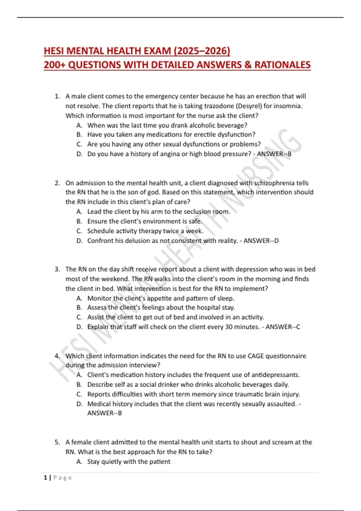HESI MENTAL HEALTH EXAM (2025–2026) 200+ QUESTIONS WITH DETAILED ANSWERS & RATIONALES