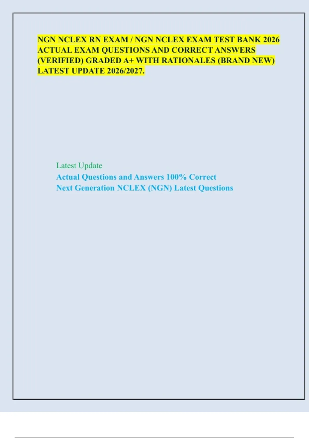 NGN NCLEX RN EXAM / NGN NCLEX EXAM TEST BANK 2026 ACTUAL EXAM QUESTIONS AND CORRECT ANSWERS (VERIFIED) GRADED A+ WITH RATIONALES (BRAND NEW) LATEST UPDATE 2026/2027. The nurse enters the room of a client who had major abdominal surgery 1 week ago and notes dehiscence and evisceration of the surgical incision. The nurse should immediately place the client in the 1. low Fowler position with the knees bent (53%) 2. prone position (2%) 3. supine position with the head of the bed flat (25%) 4. side-lying position (18%) Which of the following are correct nursing actions related to client positioning? Select allthat apply. 1. Position client in Fowler position after cardiac catheterization via femoral entry 2. Position client in Trendelenburg position on the left side if air embolism is suspected 3. Position client on the left side following a liver biopsy 4. Position client on the side with head, back, and knees flexed during lumbar puncture 5. Position client with the arm raised above the head for chest tube placement The nurse on the mental health unit is leading a group session. Shortly after the session begins, a newly admitted client with schizophrenia stands and starts to leave the room. Which of the following actions should the nurse take? 1. In a loud, firm voice, direct the client to come back to the room. (4%) 2. Gently grasp the client's arm and redirect the client back to the seat. (4%) 3. Reinforce the unit rules and importance of attending group sessions. (33%) 4. Remain silent and allow the client to leave the room with another (56%) staff member. The nurse in the emergency department is caring for a client with diabetic ketoacidosis. Which of the following actions should the nurse take first? 1. Obtain a urine specimen for urinalysis. (10%) 2. Administer an IV infusion of regular insulin. (29%) 3. Request a prescription for potassium chloride. (2%) 4. Administer an IV bolus of 0.9% sodium chloride. (56%) The nurse is preparing to instill dialysate for a client who is receiving peritoneal dialysis. It would be a priority for the nurse to 1. place the client in the semi-Fowler position (15%) 2. record the characteristics of the dialysate output (6%) 3. use sterile technique when spiking and attaching the bag of dialysate (54%) 4. ensure that the drainage collection bag is below the level of the abdomen (23%) The nurse is assessing a 5-year-old client with sickle cell disease who is experiencing an episode of acute pain. The client has shortness of breath, nausea with vomiting, and generalized body and joint pain. Which finding requires immediate intervention? Click the exhibit button for additional client information. 1. enlarged spleen on palpation (37%) 2. hemoglobin level of 9.0 g/dL (90 g/L) (17%) 3. pain rated as 8 on the Wong-Baker FACES Scale (26%) 4. bilateral swelling of the hands and feet (17%) A nurse on an orthopedic unit is caring for four clients with a casted extremity. Which client does the nurse prioritize to see first? 1. Client reporting a tingling sensation (80%) 2. Client reporting itching under the cast (0%) 3. Client reporting pain of 5/10 on movement (1%) 4. Client reporting throbbing on dependent positioning (16%) The nurse is talking with a client who has schizophrenia. The client states, "I had a pet rabbit when I was growing up. Carrots are probably my favorite vegetable. Do you know that oranges grow on trees?" The nurse should recognize that the client is demonstrating 1. associative looseness (54%) 2. concrete thinking (6%) 3. tangentiality (17%) 4. neologisms (21%)