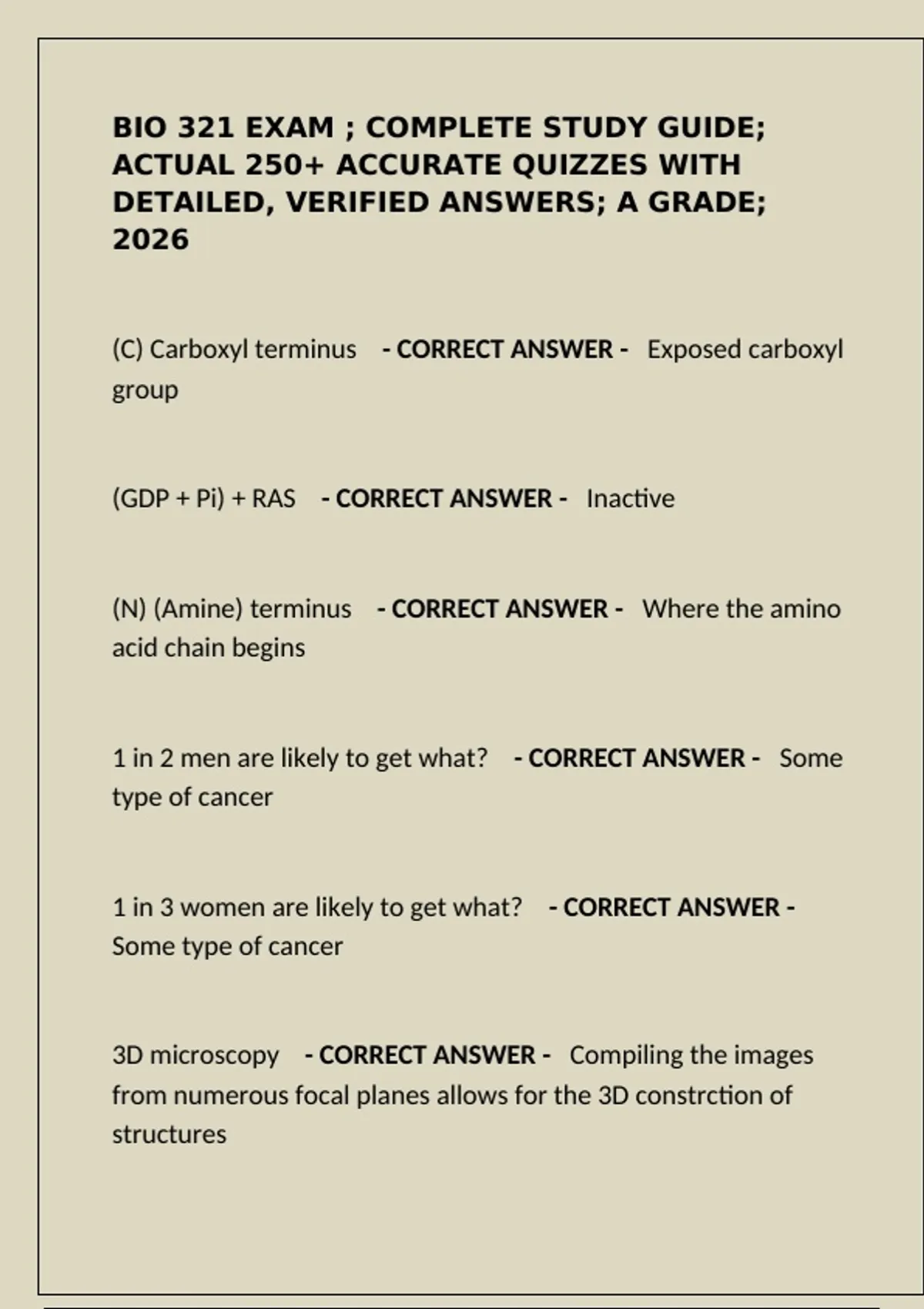 Master BIO 321 with this complete study guide featuring 250+ accurate quiz questions and detailed verified answers. Covers proteins, cell structure, cancer biology, microscopy techniques, signaling pathways (Ras, APC), and molecular regulation. Designed for an A grade in 2026.