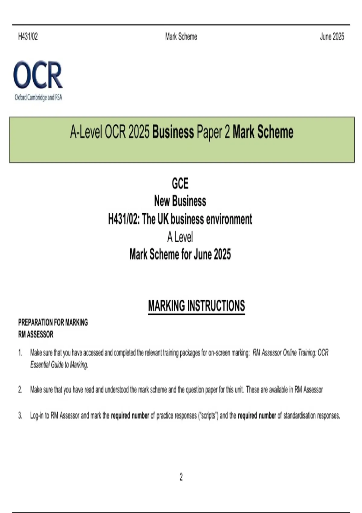 A-Level OCR 2025 Business Paper 2 Mark Scheme