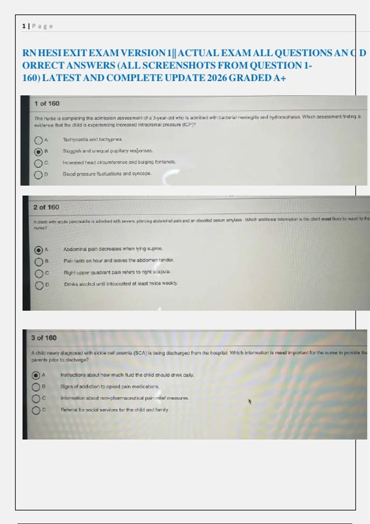 RN HESI EXIT EXAM VERSION 1|| ACTUAL EXAM ALL QUESTIONS AN C D