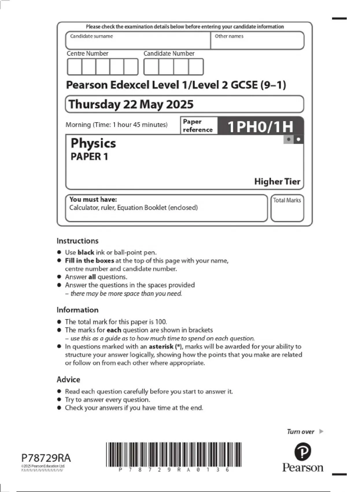 Edexcel GCSE 2025 Triple Science Physics Higher Tier Paper 1H Question Paper