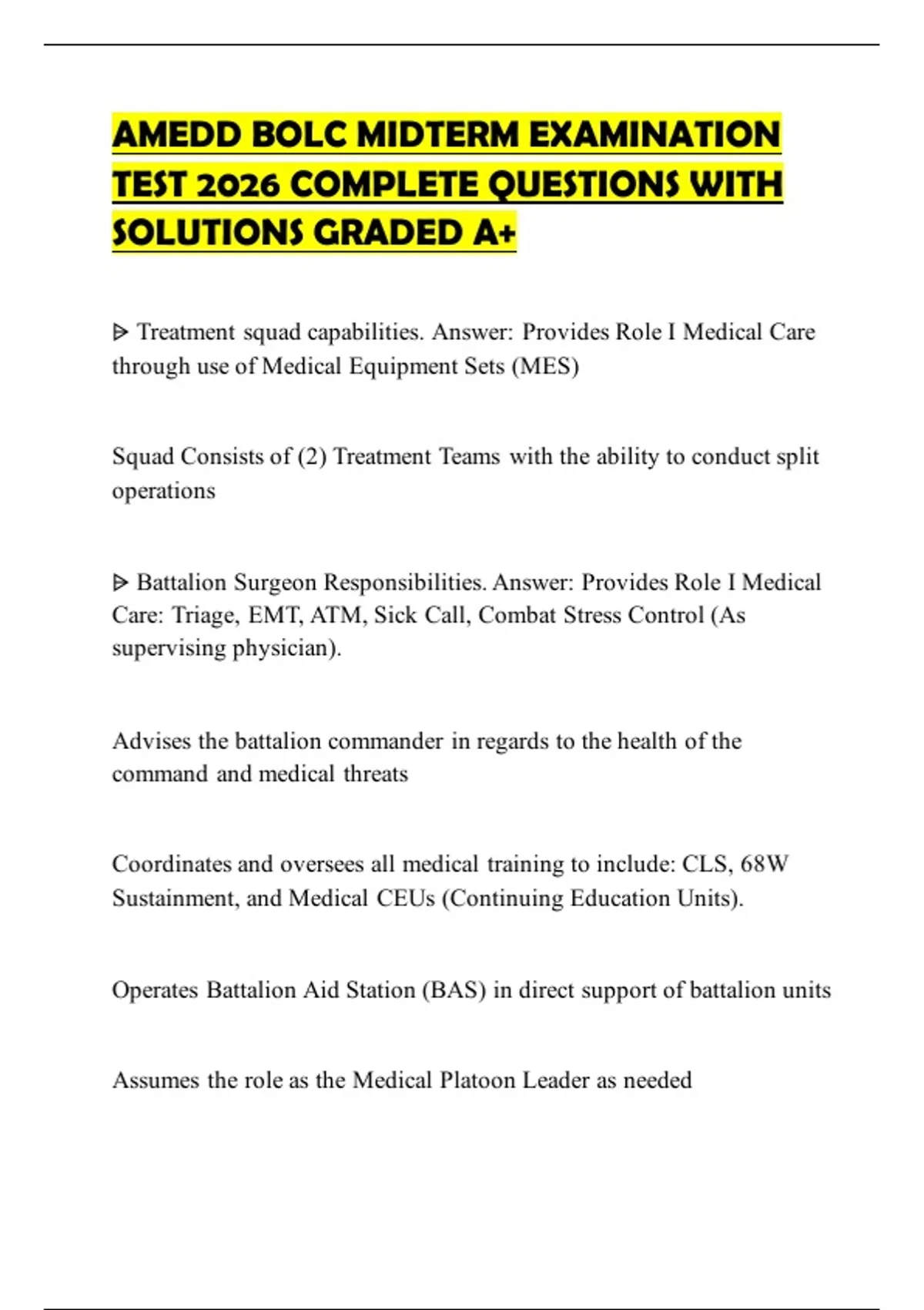 Triage, EMT, ATM, Sick Call, Combat Stress Control (Assists