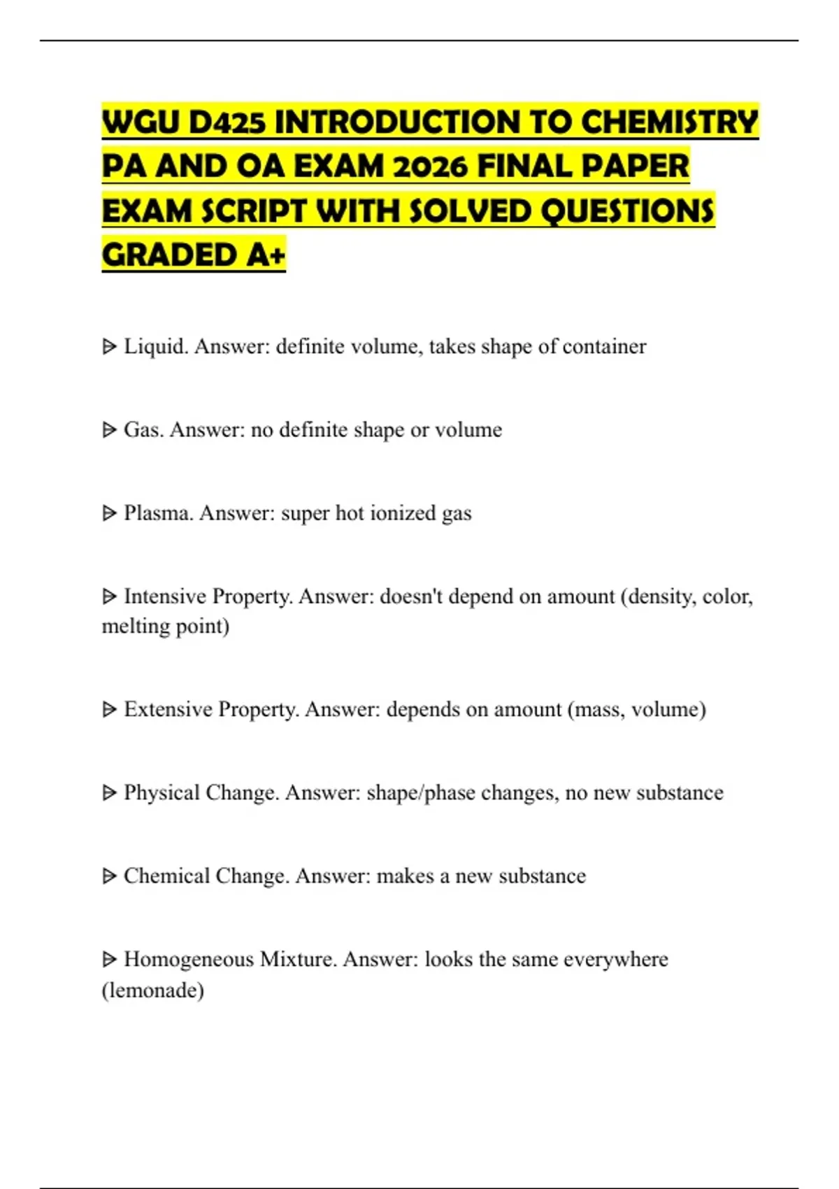 WGU D425 INTRODUCTION TO CHEMISTRY PA AND OA EXAM 2026 FINAL PAPER EXAM SCRIPT WITH SOLVED QUESTIONS GRADED A+
