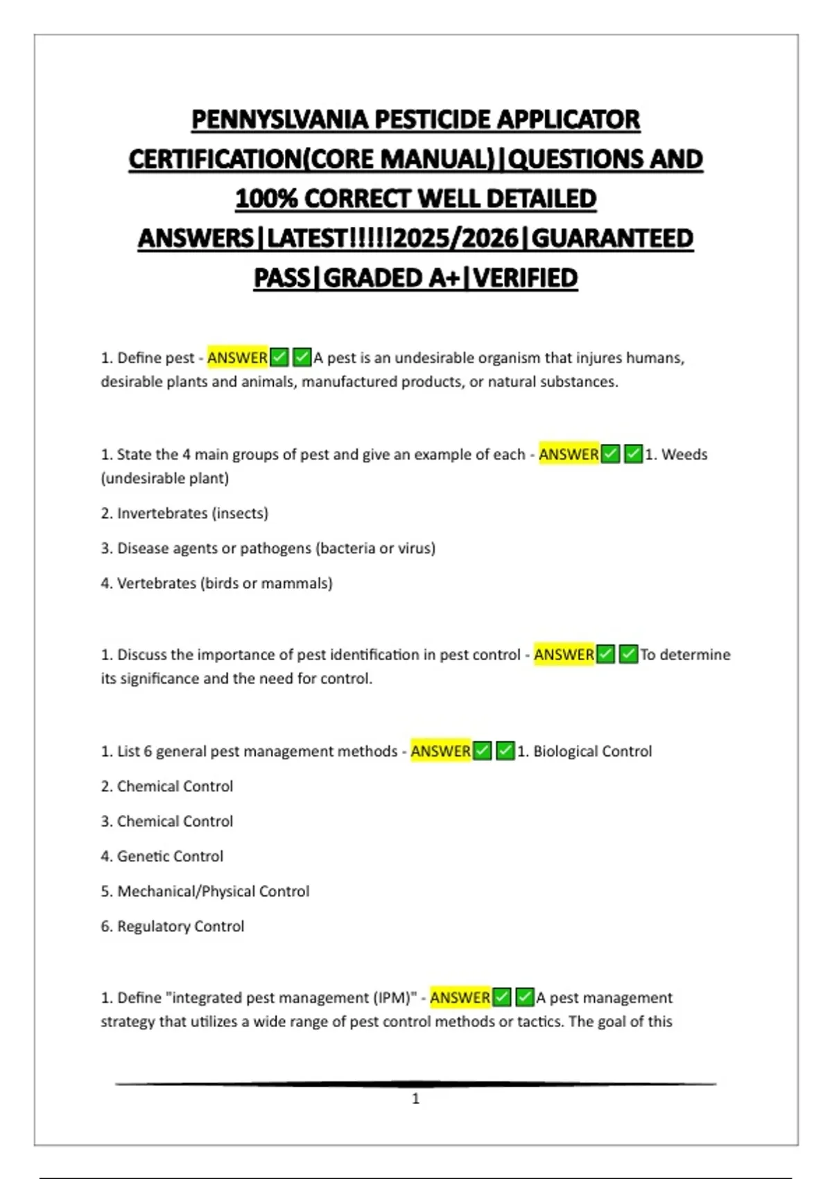 1. List 6 general pest management methods - ANSWER 1. Biological Control