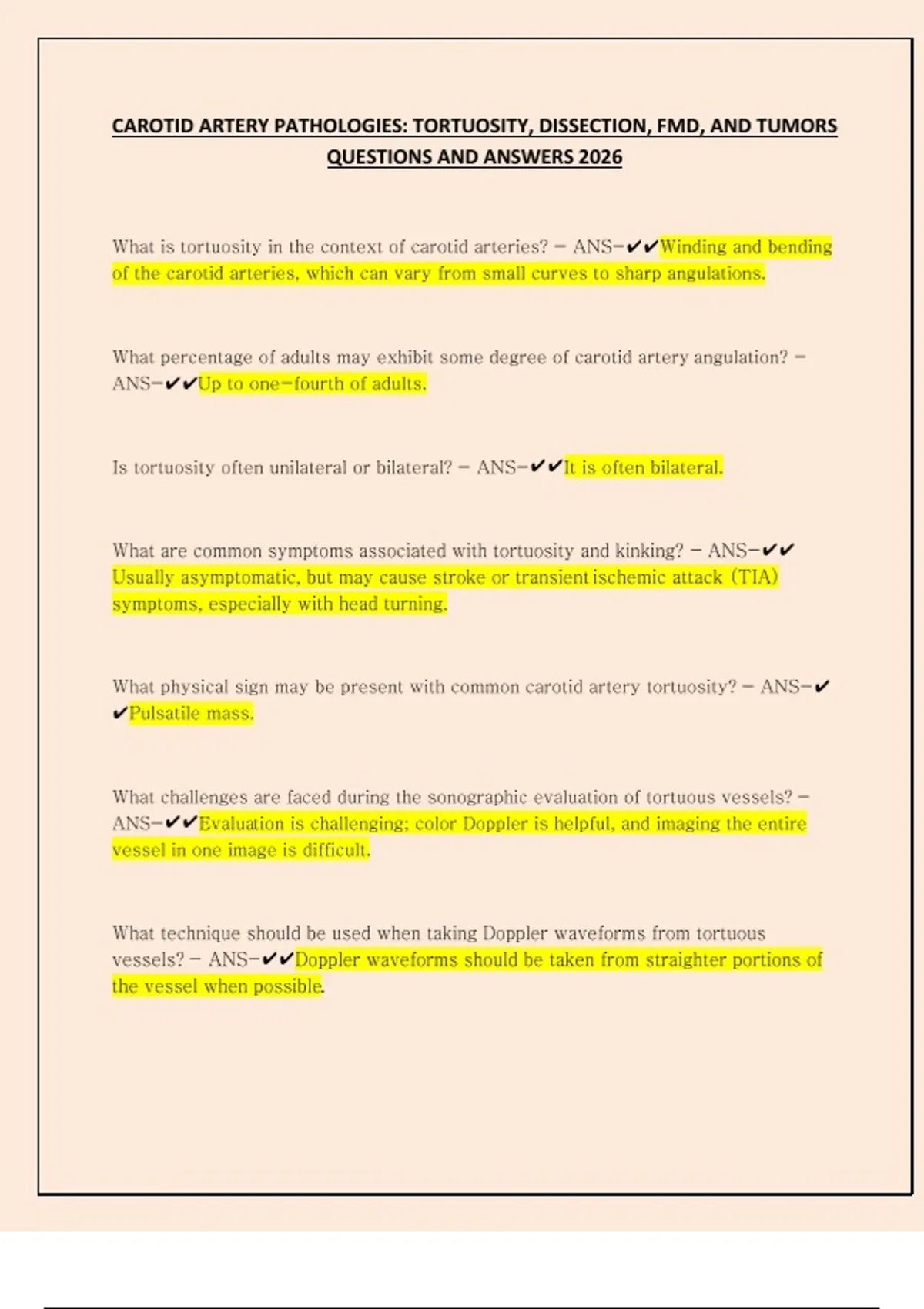 CAROTID ARTERY PATHOLOGIES - TORTUOSITY, DISSECTION, FMD, AND TUMORS QUESTIONS AND ANSWERS 2026