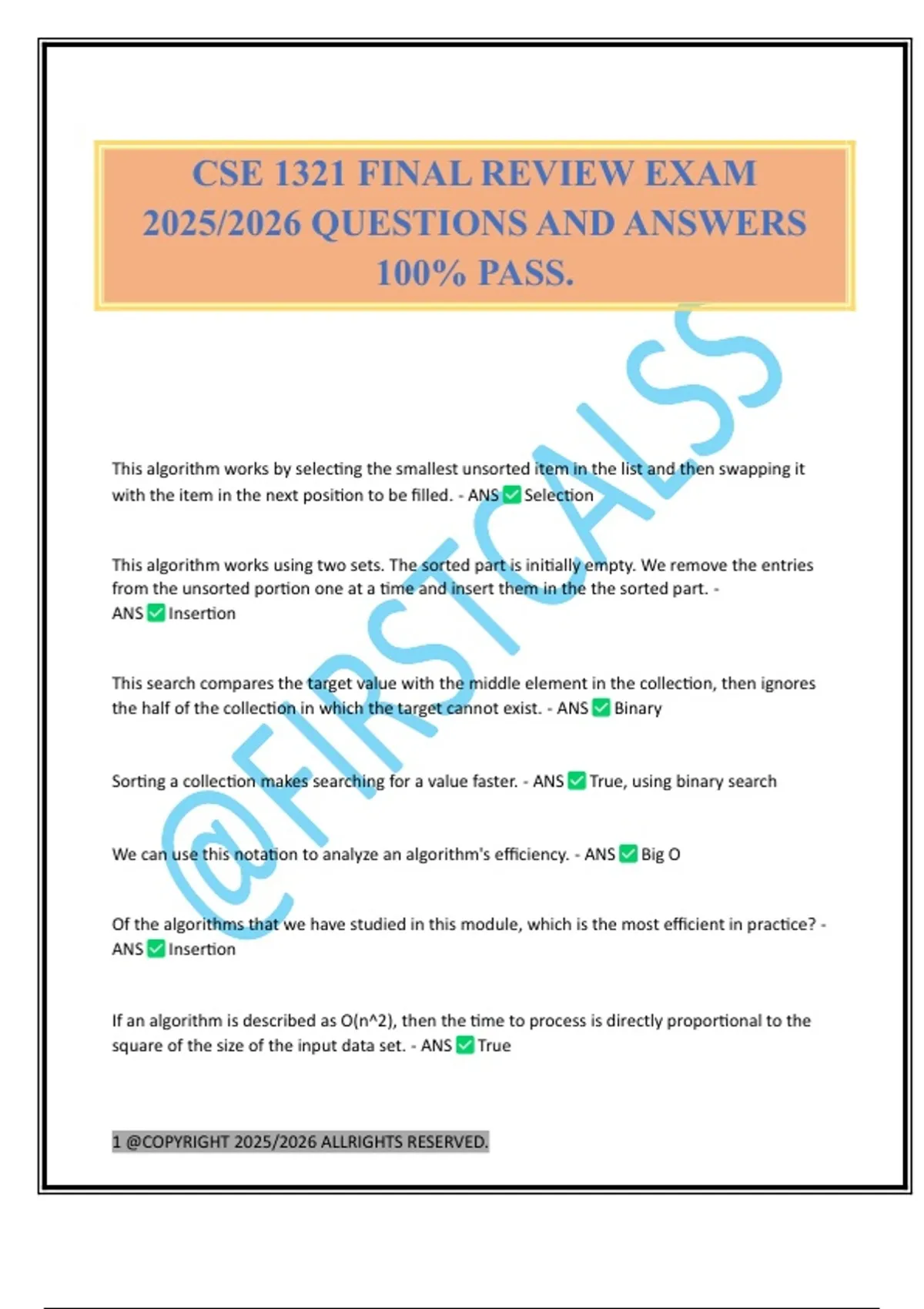 CSE 1321 FINAL REVIEW EXAM 2025/2026 QUESTIONS AND ANSWERS 100% PASS.