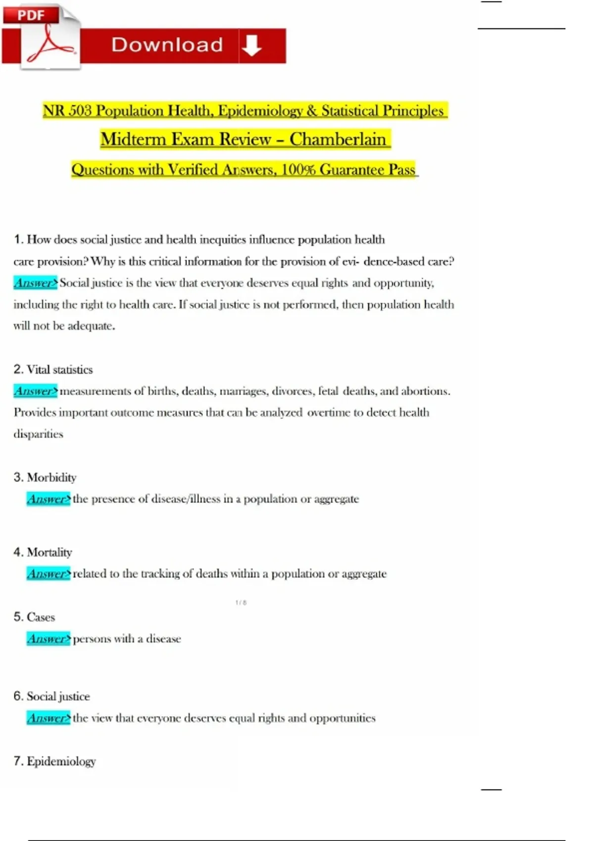 NR 503 Population Health, Epidemiology & Statistical Principles Midterm Exam Review – Chamberlain Latest Update.pdf