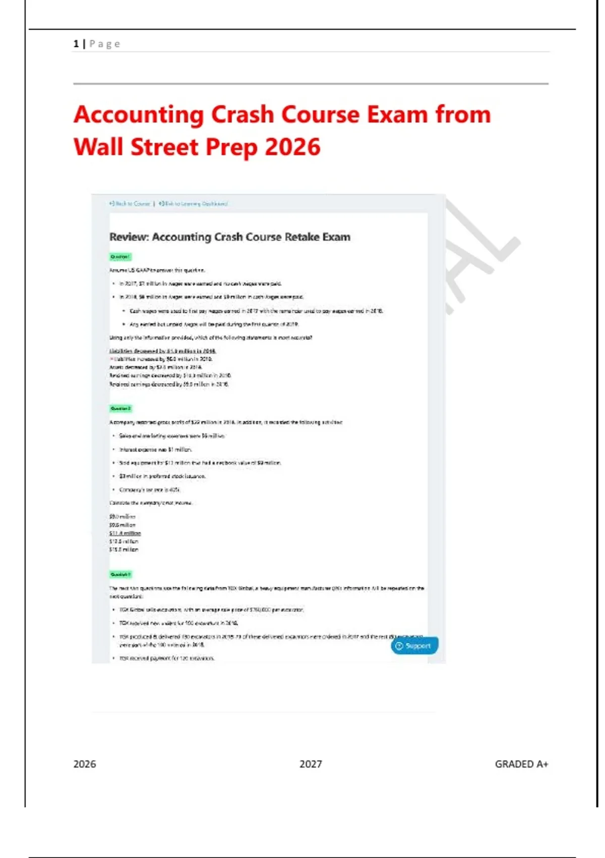 This document contains a complete Accounting Crash Course exam solution aligned with Wall Street Prep 2026 standards. It covers key financial accounting concepts including the income statement, balance sheet, cash flow statement, and common exam adjustments. Ideal for students preparing for finance, accounting, and investment banking exams.