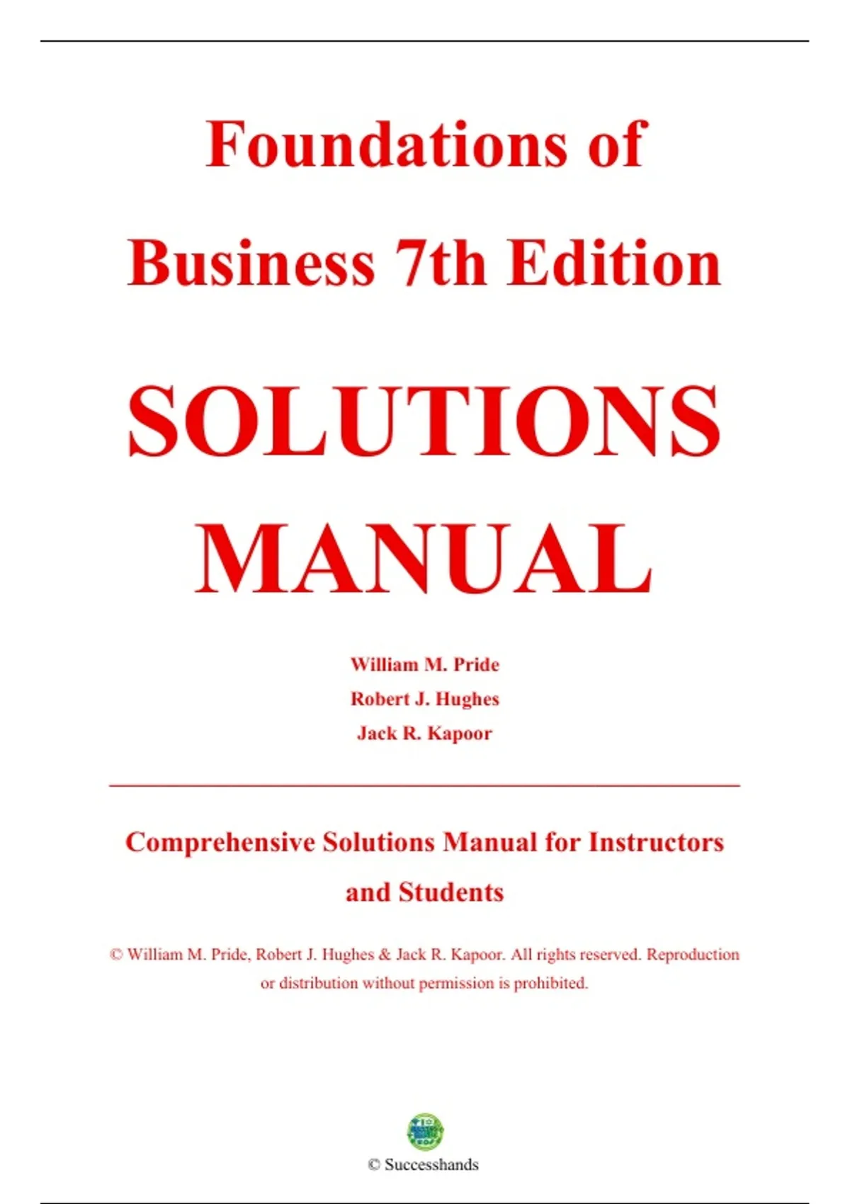 Complete Solutions Manual — Foundations of Business, 7th Edition — William M. Pride — ISBN 9780357717943 — (All Chapters Covered 1–18, Solutions Included). Chapters included: Chapter 1 Exploring the World of Business and Economics, Chapter 2 Ethics and Social Responsibility in Business, Chapter 3 Global Business, Chapter 4 Choosing a Form of Business Ownership, Chapter 5 Small Business, Entrepreneurship, and Franchises, Chapter 6 Understanding the Management Process, Chapter 7 Creating a Flexible Organization, Chapter 8 Producing Quality Goods and Services, Chapter 9 Attracting and Retaining the Best Employees, Chapter 10 Motivating and Satisfying Employees, Chapter 11 Building Customer Relationships Through Effective Marketing, Chapter 12 Creating and Pricing Products That Satisfy Customers, Chapter 13 Distributing and Promoting Products, Chapter 14 Exploring Social Media and e-Business, Chapter 15 Using Management and Accounting Information, Chapter 16 Mastering Financial Management, Chapter 17 Understanding Personal Finances and Investments (online), Chapter 18 Enhancing Union-Management Relations (online).