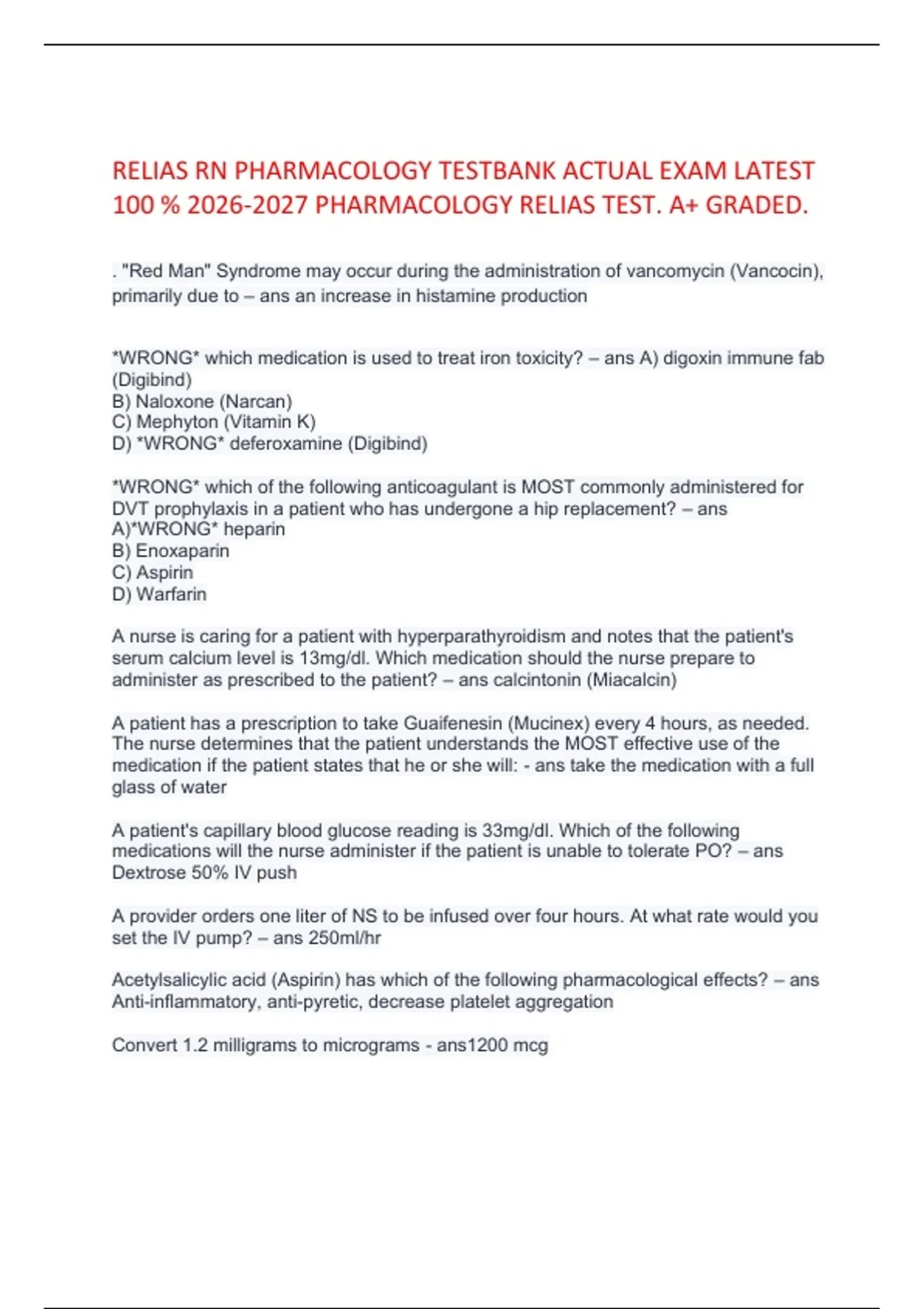 100 % 2026-2027 PHARMACOLOGY RELIAS TEST. A+ GRADED.