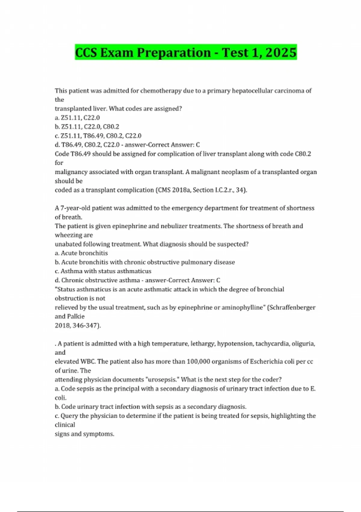 CCS Exam Preparation - Test 1, 2025 This patient was admitted for chemotherapy due to a primary hepatocellular carcinoma of the transplanted liver. What codes are assigned? a. Z51.11, C22.0 b. Z51.11, C22.0, C80.2 c. Z51.11, T86.49, C80.2, C22.0 d. T86.49, C80.2, C22.0 - answer-Correct Answer: C Code T86.49 should be assigned for complication of liver transplant along with code C80.2 for malignancy associated with organ transplant. A malignant neoplasm of a transplanted organ should be coded as a transplant complication (CMS 2018a, Section I.C.2.r., 34). A 7-year-old patient was admitted to the emergency department for treatment of shortness of breath. The patient is given epinephrine and nebulizer treatments. The shortness of breath and wheezing are unabated following treatment. What diagnosis should be suspected? a. Acute bronchitis b. Acute bronchitis with chronic obstructive pulmonary disease c. Asthma with status asthmaticus d. Chronic obstructive asthma - answer-Correct Answer: C "Status asthmaticus is an acute asthmatic attack in which the degree of bronchial obstruction is not relieved by the usual treatment, such as by epinephrine or aminophylline" (Schraffenberger and Palkie 2018, 346-347). . A patient is admitted with a high temperature, lethargy, hypotension, tachycardia, oliguria, and elevated WBC. The patient also has more than 100,000 organisms of Escherichia coli per cc of urine. The attending physician documents "urosepsis." What is the next step for the coder? a. Code sepsis as the principal with a secondary diagnosis of urinary tract infection due to E. coli. b. Code urinary tract infection with sepsis as a secondary diagnosis. c. Query the physician to determine if the patient is being treated for sepsis, highlighting the clinical signs and symptoms.
