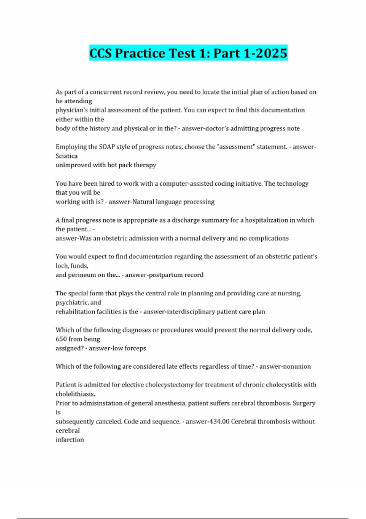 CCS Practice Test 1: Part 1-2025 As part of a concurrent record review, you need to locate the initial plan of action based on he attending physician's initial assessment of the patient. You can expect to find this documentation either within the body of the history and physical or in the? - answer-doctor's admitting progress note Employing the SOAP style of progress notes, choose the "assessment" statement. - answer Sciatica unimproved with hot pack therapy You have been hired to work with a computer-assisted coding initiative. The technology that you will be working with is? - answer-Natural language processing A final progress note is appropriate as a discharge summary for a hospitalization in which the patient... - answer-Was an obstetric admission with a normal delivery and no complications You would expect to find documentation regarding the assessment of an obstetric patient's loch, funds, and perineum on the... - answer-postpartum record The special form that plays the central role in planning and providing care at nursing, psychiatric, and rehabilitation facilities is the - answer-interdisciplinary patient care plan Which of the following diagnoses or procedures would prevent the normal delivery code, 650 from being assigned? - answer-low forceps Which of the following are considered late effects regardless of time? - answer-nonunion Patient is admitted for elective cholecystectomy for treatment of chronic cholecystitis with cholelithiasis. Prior to admisinstation of general anesthesia, patient suffers cerebral thrombosis. Surgery is subsequently canceled. Code and sequence. - answer-434.00 Cerebral thrombosis without cerebral infarction