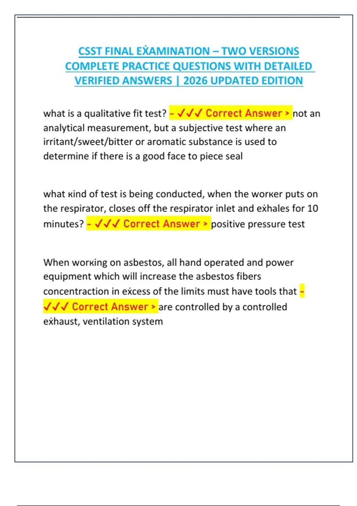 This document contains two complete versions of CSST final examination practice questions, each with detailed and verified answers covering the full scope of the course material. It is designed to help students prepare effectively for the CSST final exam by practicing exam-style questions and reviewing step-by-step solutions. The content is fully updated for the 2026 examination period and suitable for thorough revision and self-assessment.