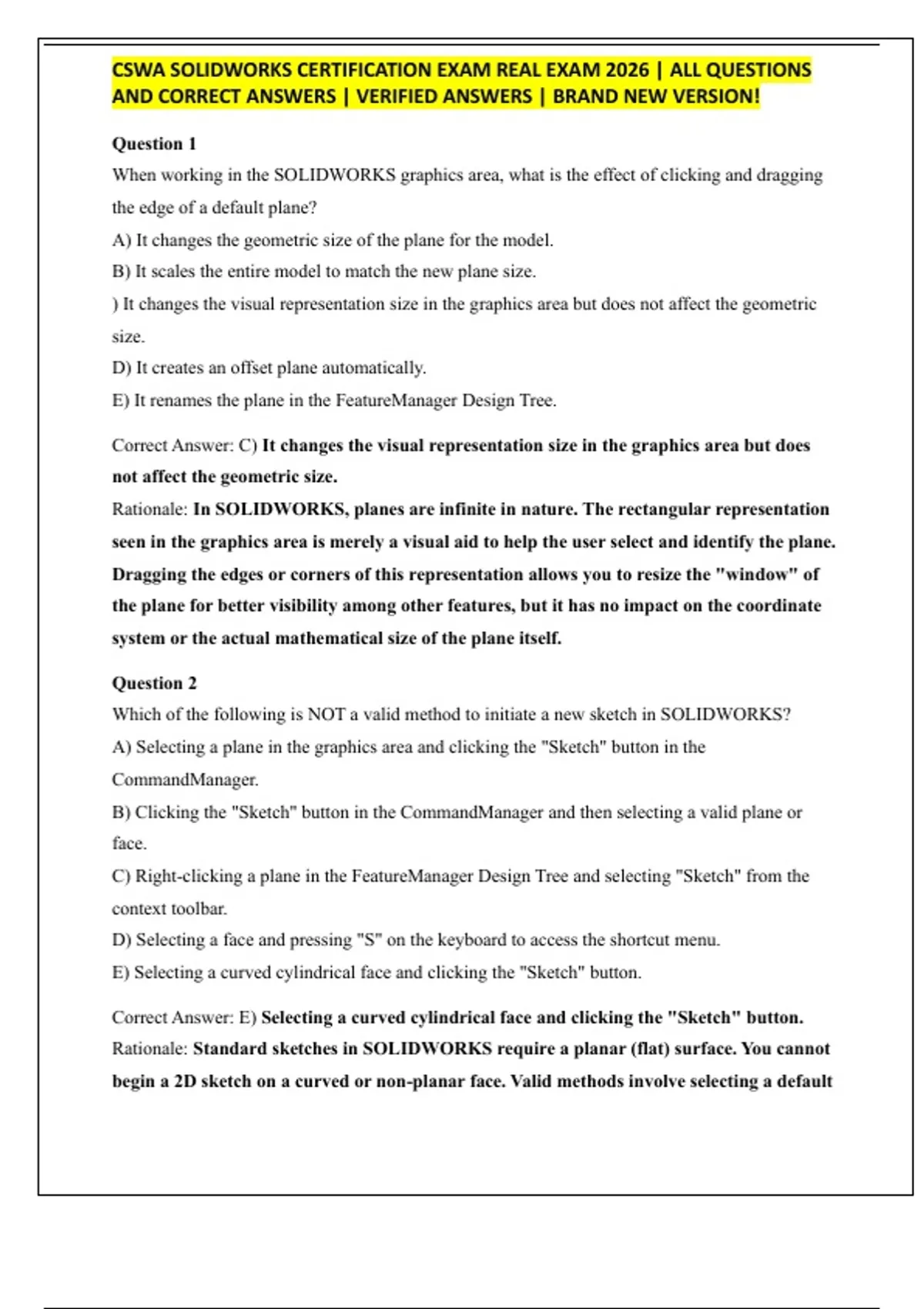 CSWA SOLIDWORKS CERTIFICATION EXAM REAL EXAM 2026 | ALL QUESTIONS AND CORRECT ANSWERS | VERIFIED ANSWERS | BRAND NEW VERSION!