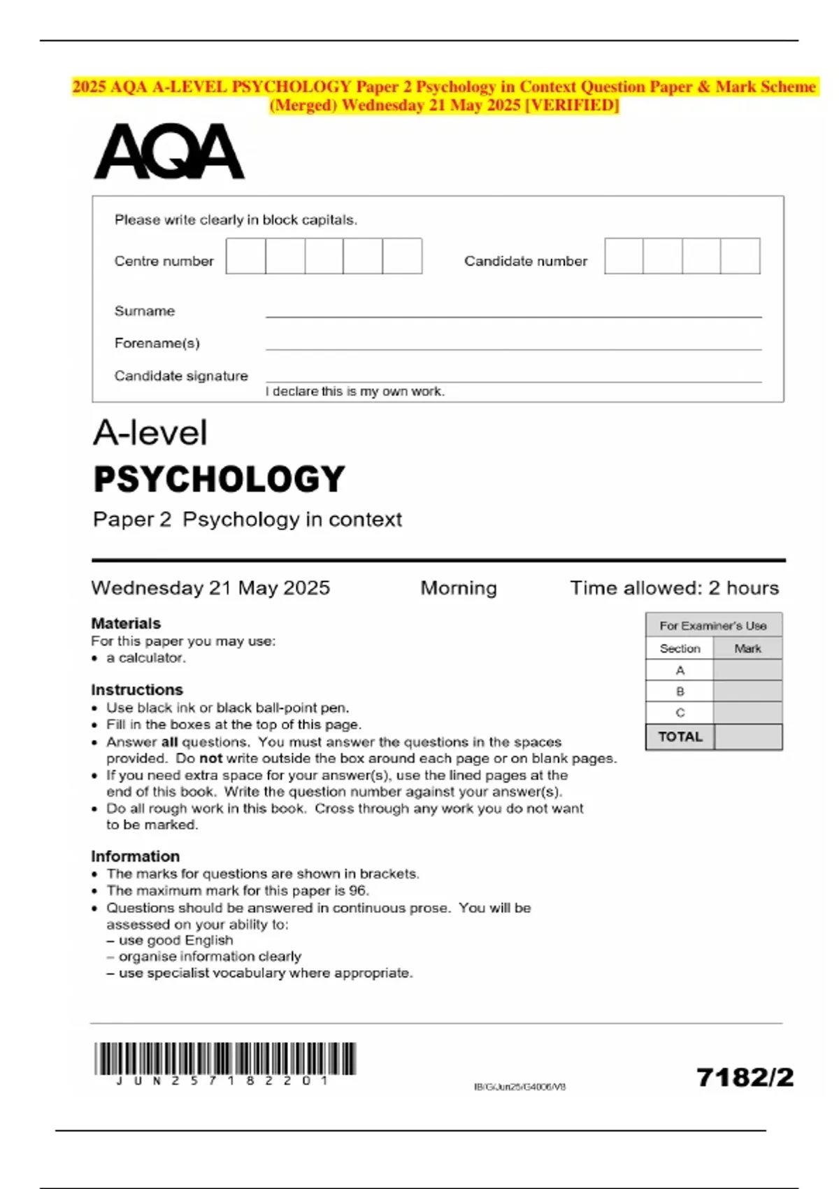 2025 AQA A-LEVEL PSYCHOLOGY Paper 2 Psychology in Context Question Paper & Mark Scheme (Merged) Wednesday 21 May 2025 [VERIFIED]