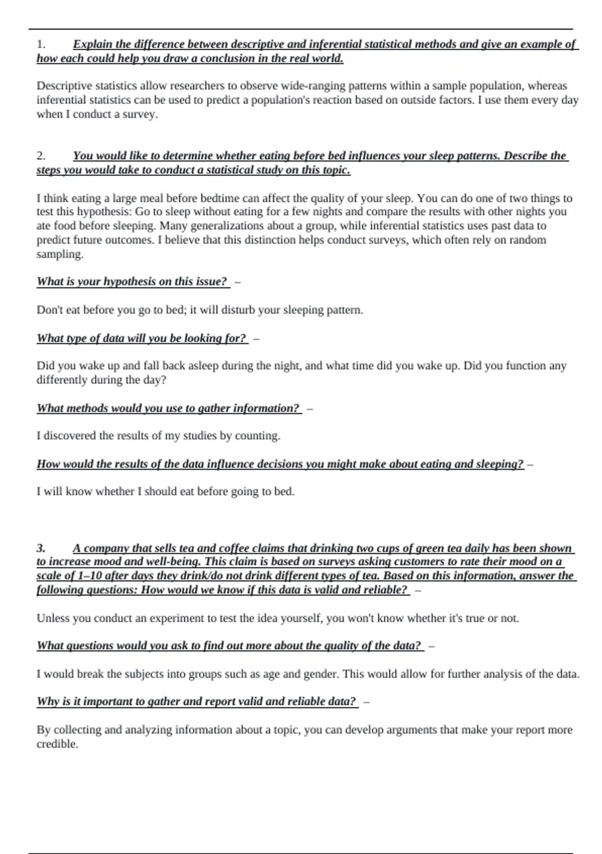 2. You would like to determine whether eating before bed influences your sleep patterns. Describe the