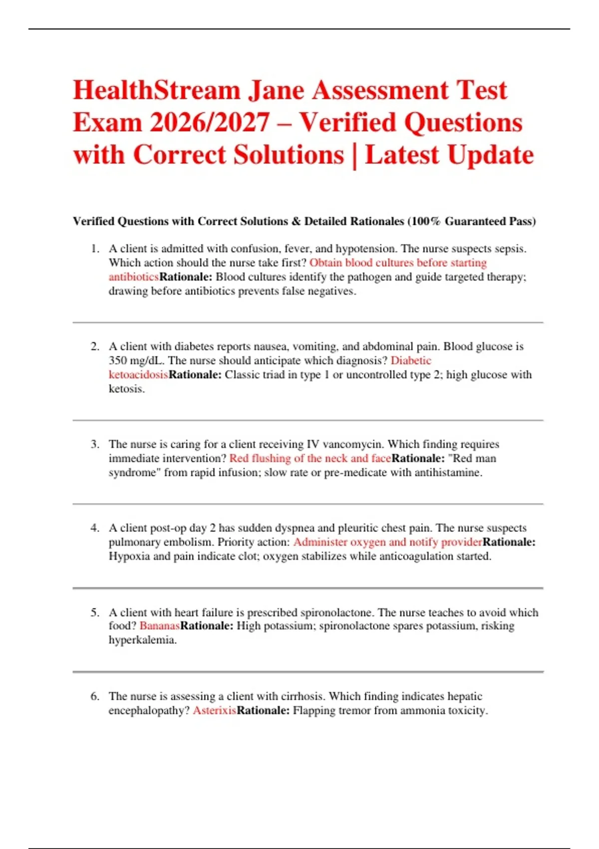 This document contains real HealthStream Jane Assessment Test exam questions for the 2026/2027 update, with verified questions and correct, clearly explained solutions. It covers key competency areas assessed on the Jane platform, including clinical judgment, patient safety, communication, documentation, and scenario-based decision-making. The material reflects real exam-style content to support accurate and effective preparation for the assessment.