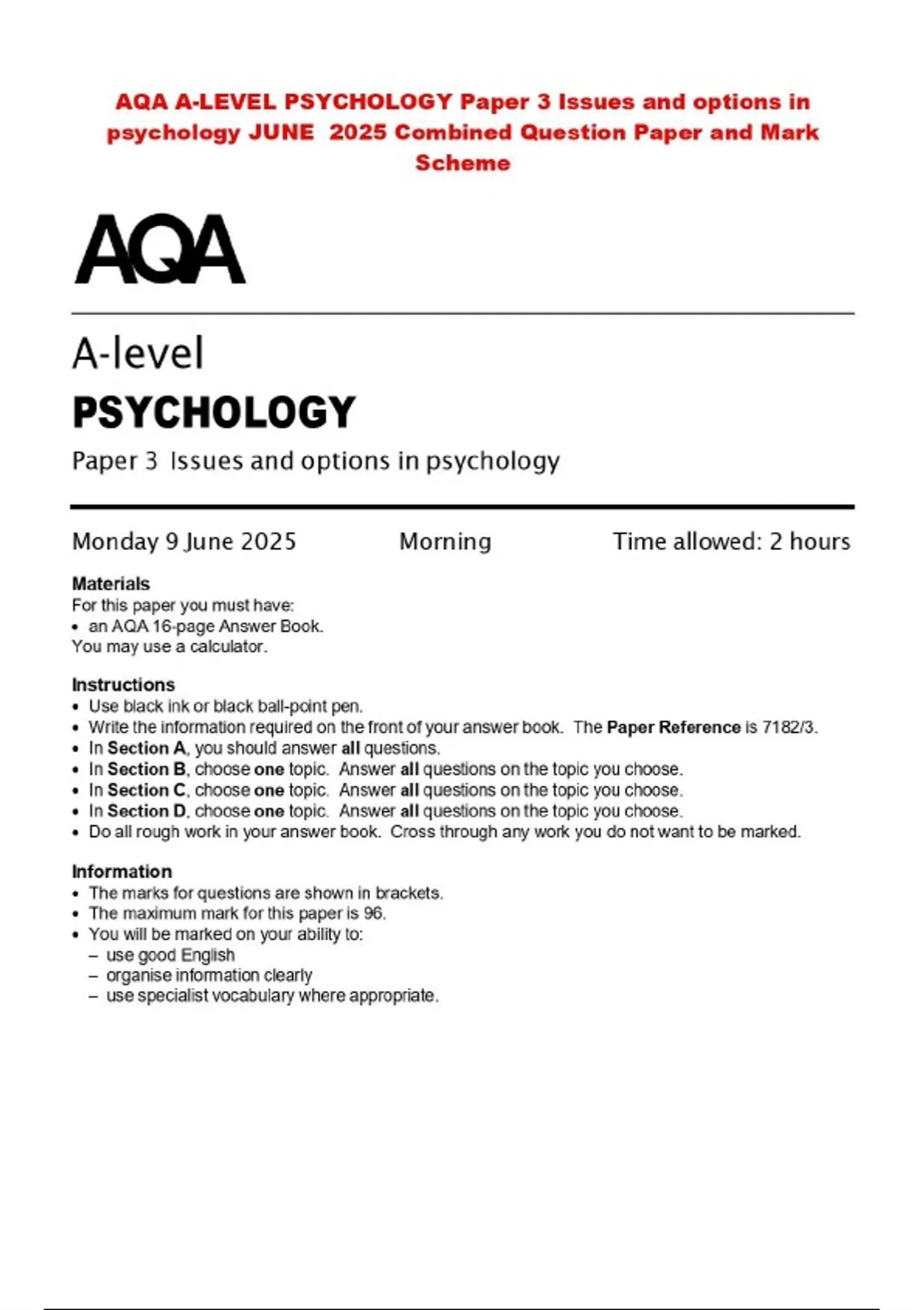 AQA A-LEVEL PSYCHOLOGY Paper 3 Issues and options in psychology JUNE 2025 Combined Question Paper and Mark Scheme