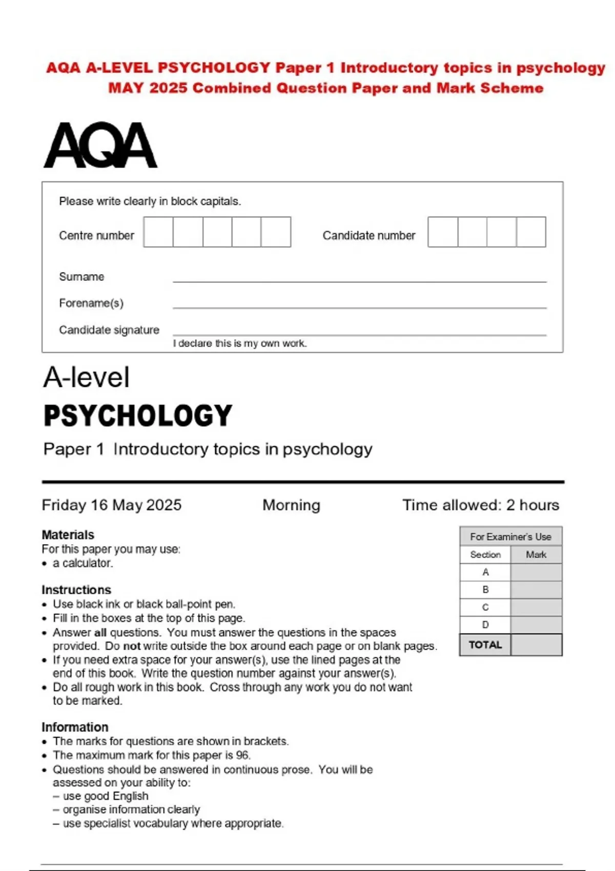 AQA A-LEVEL PSYCHOLOGY Paper 1 Introductory topics in psychology MAY 2025 Combined Question Paper and Mark Scheme