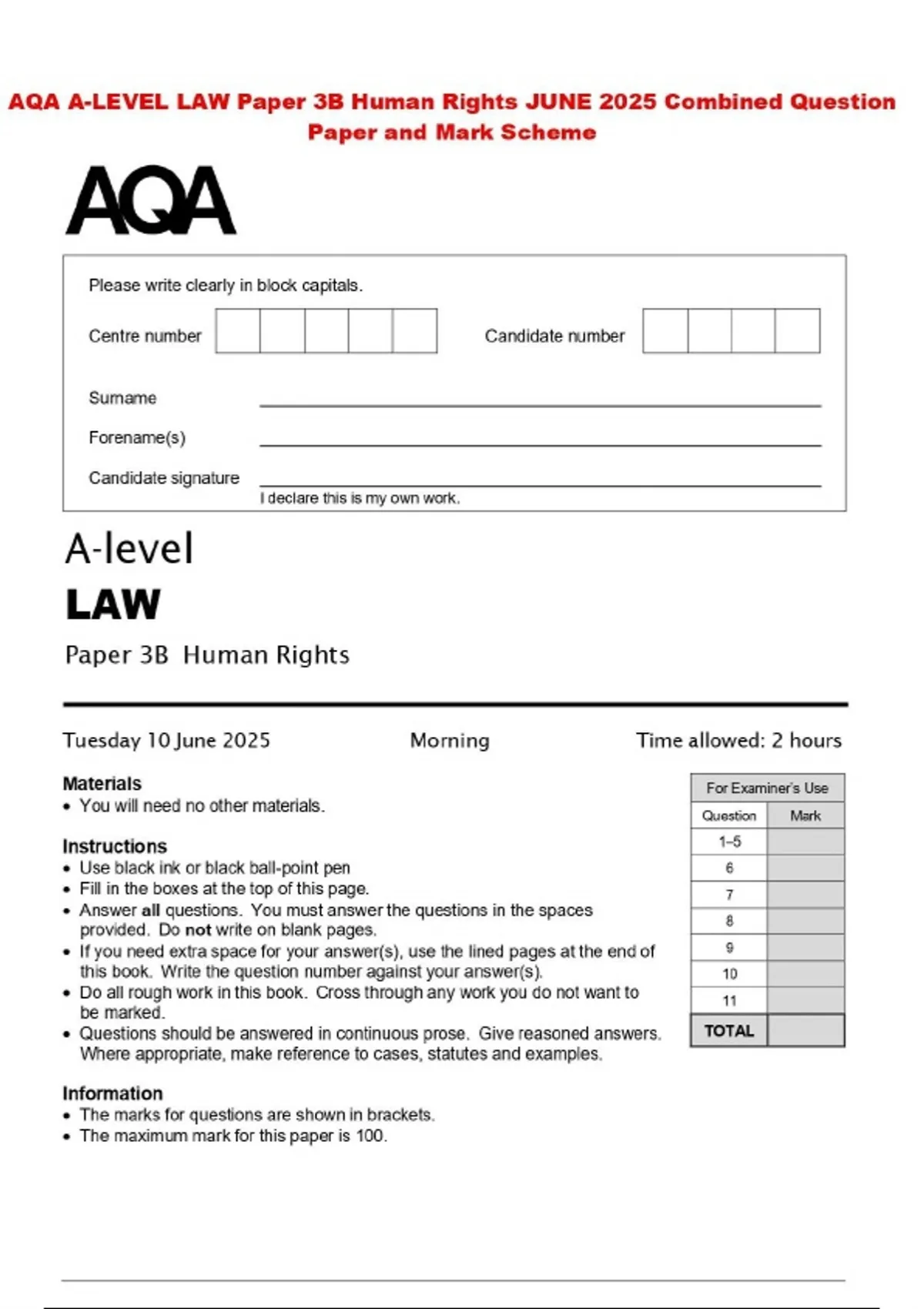 AQA A-LEVEL LAW Paper 3B Human Rights JUNE 2025 Combined Question Paper and Mark Scheme