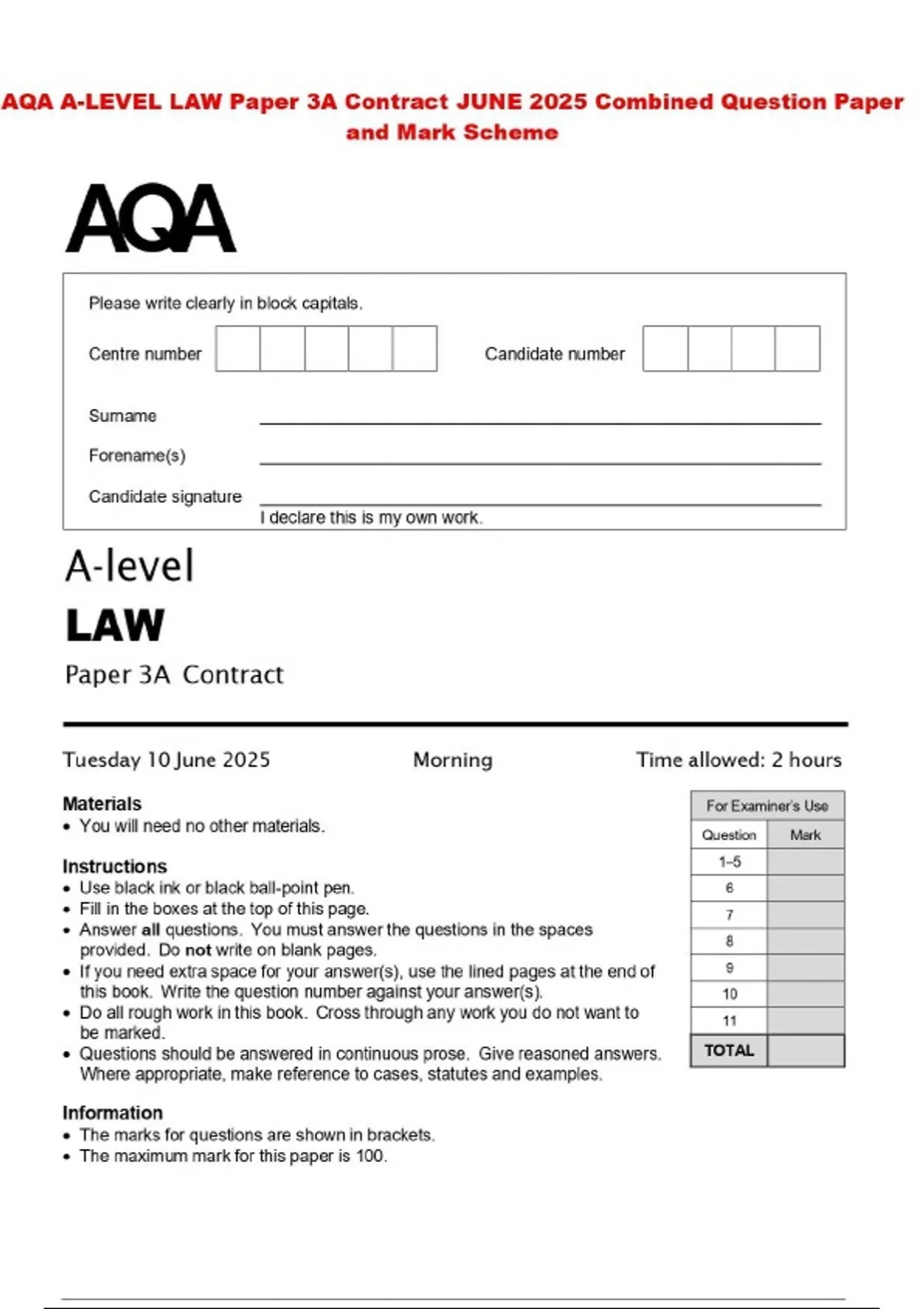 AQA A-LEVEL LAW Paper 3A Contract JUNE 2025 Combined Question Paper and Mark Scheme