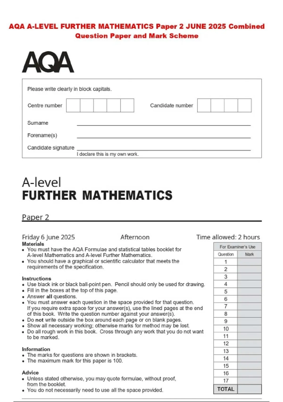 AQA A-LEVEL FURTHER MATHEMATICS Paper 2 JUNE 2025 Combined Question Paper and Mark Scheme