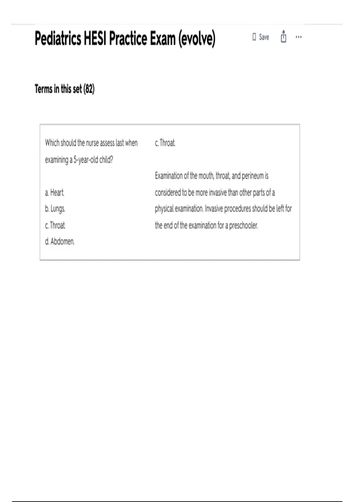 Which should the nurse assess last when c. Throat.