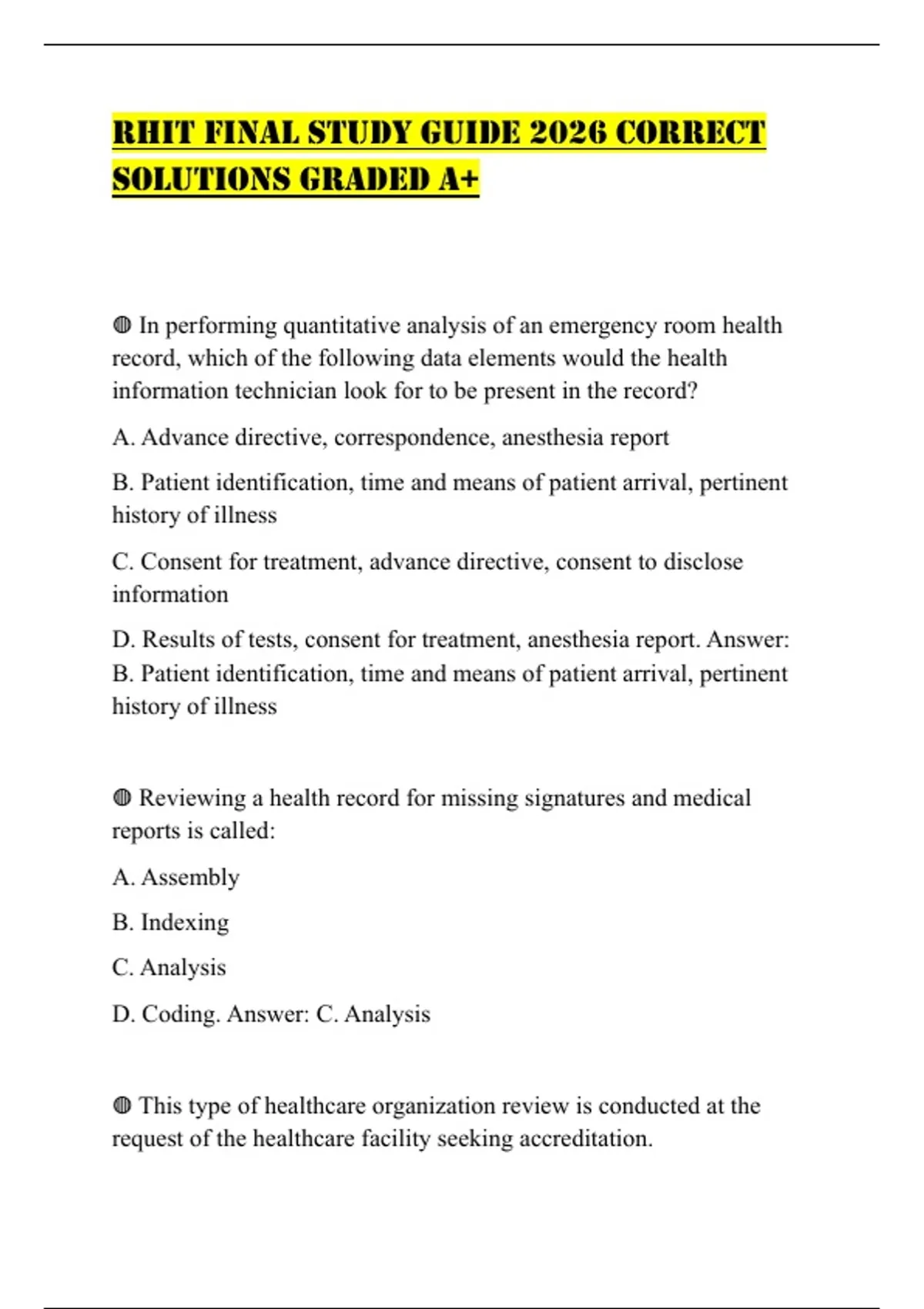 RHIT FINAL STUDY GUIDE 2026 CORRECT SOLUTIONS GRADED A+