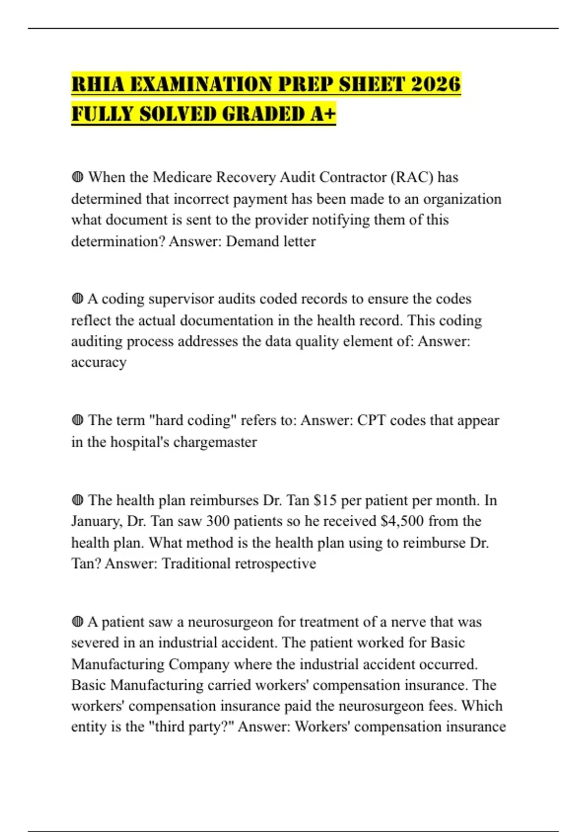 RHIA EXAMINATION PREP SHEET 2026 FULLY SOLVED GRADED A+