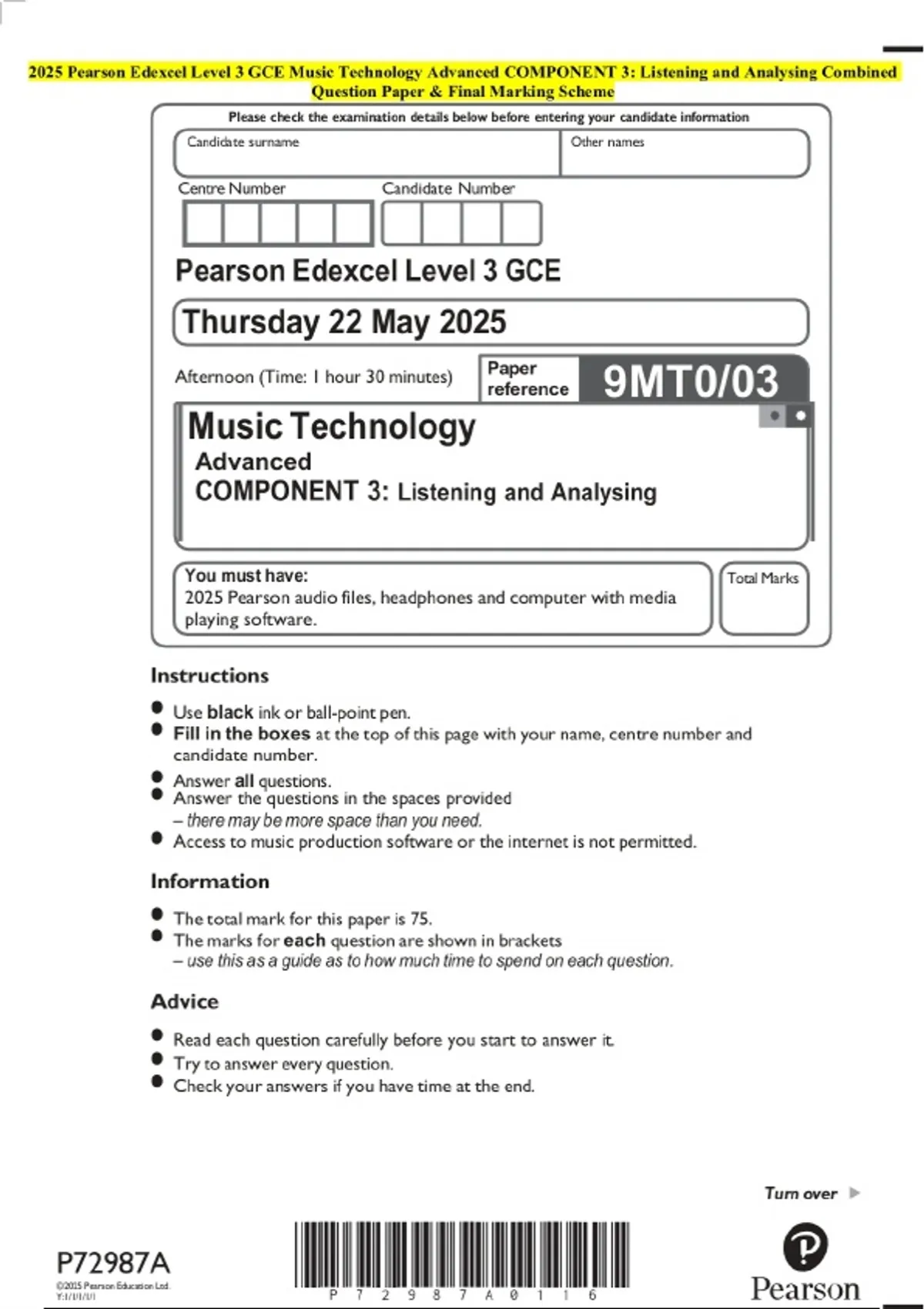 2025 Pearson Edexcel Level 3 GCE Music Technology Advanced COMPONENT 3: Listening and Analysing Combined Question paper and approved marking scheme