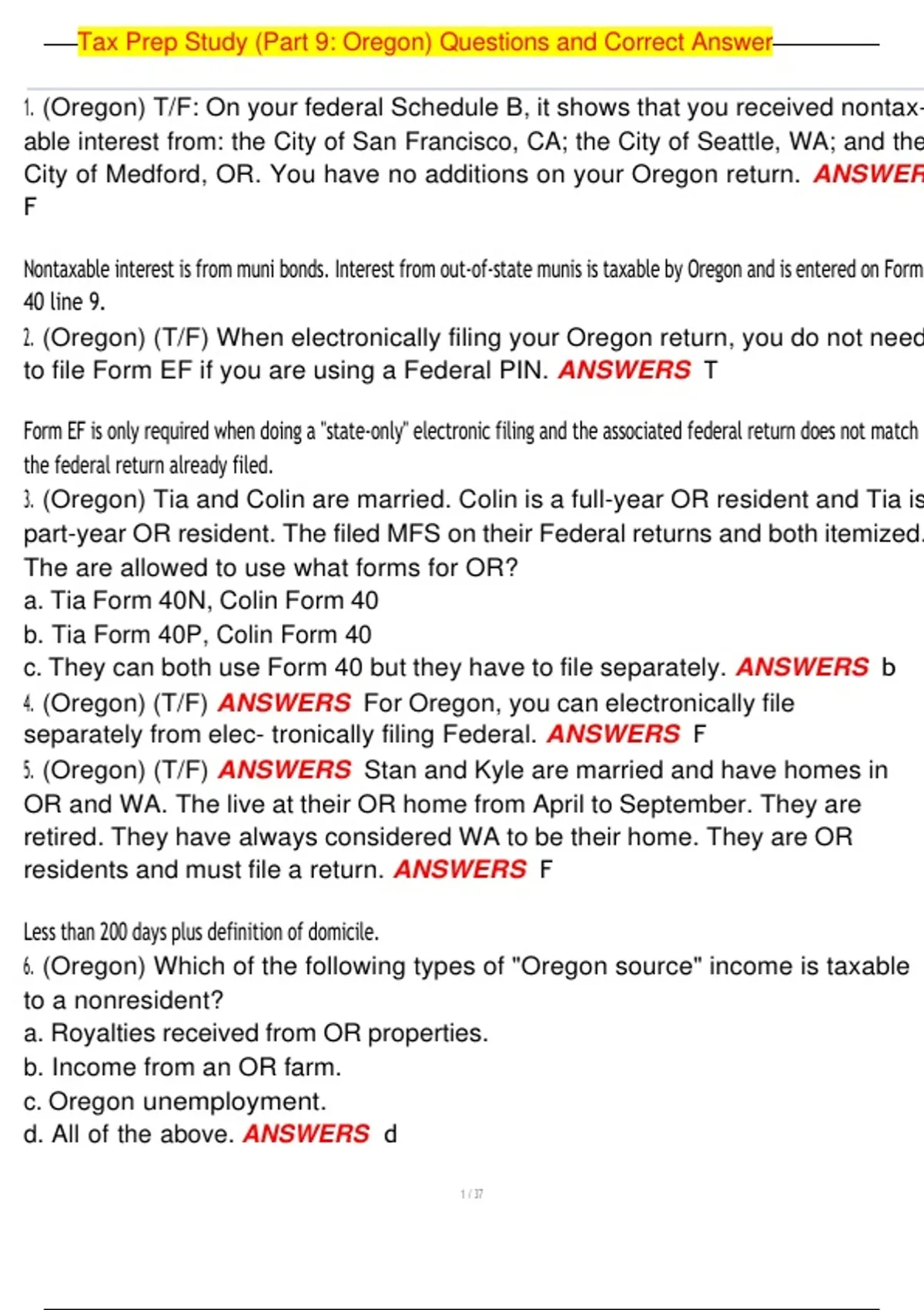 Tax Prep Study (Part 9; Oregon) Questions and Correct Answer