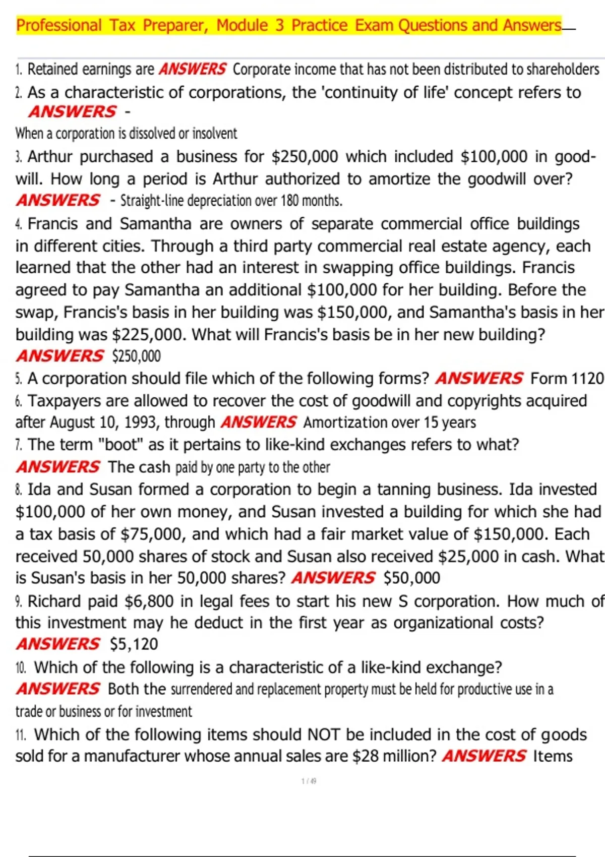 Professional Tax Preparer, Module 3 Practice Exam Questions and Answers