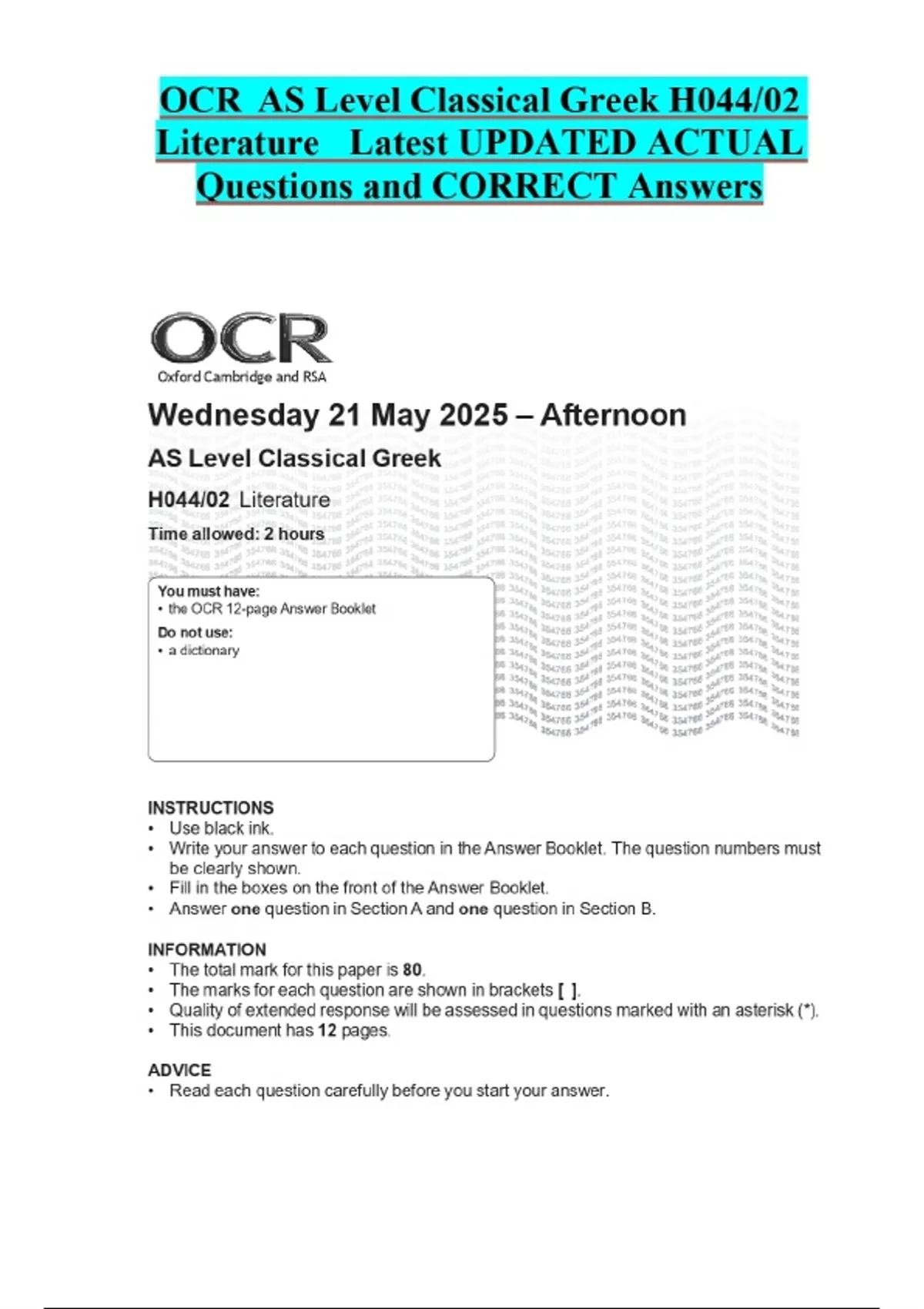 OCR AS Level Classical Greek H044/02 Literature Latest UPDATED ACTUAL Questions and CORRECT Answers