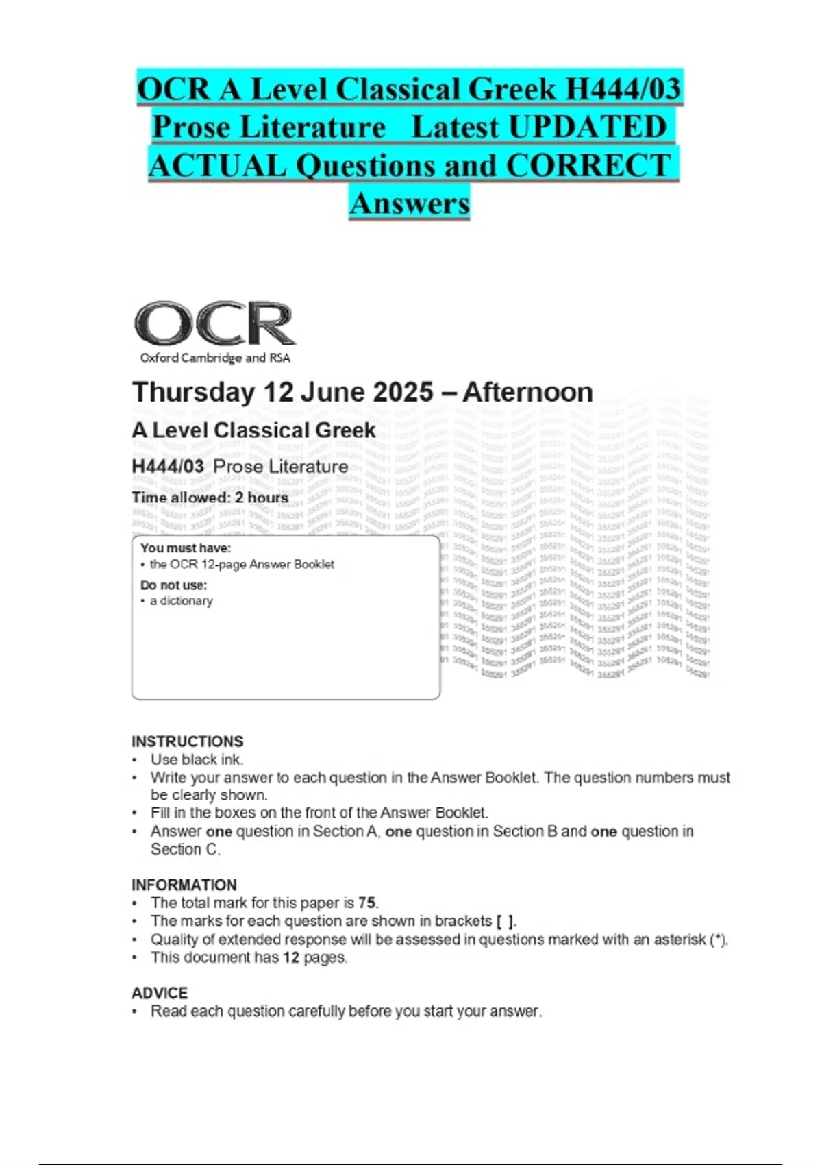 OCR A Level Classical Greek H444/03 Prose Literature Latest UPDATED ACTUAL Questions and CORRECT Answers