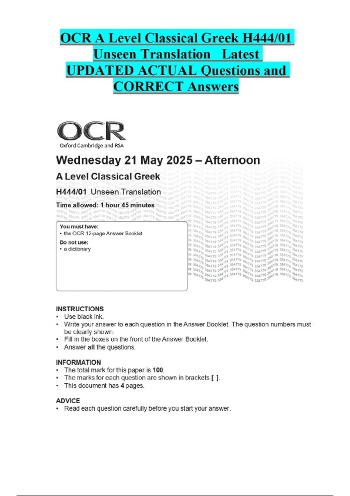 OCR A Level Classical Greek H444/01 Unseen Translation Latest UPDATED ACTUAL Questions and CORRECT Answers
