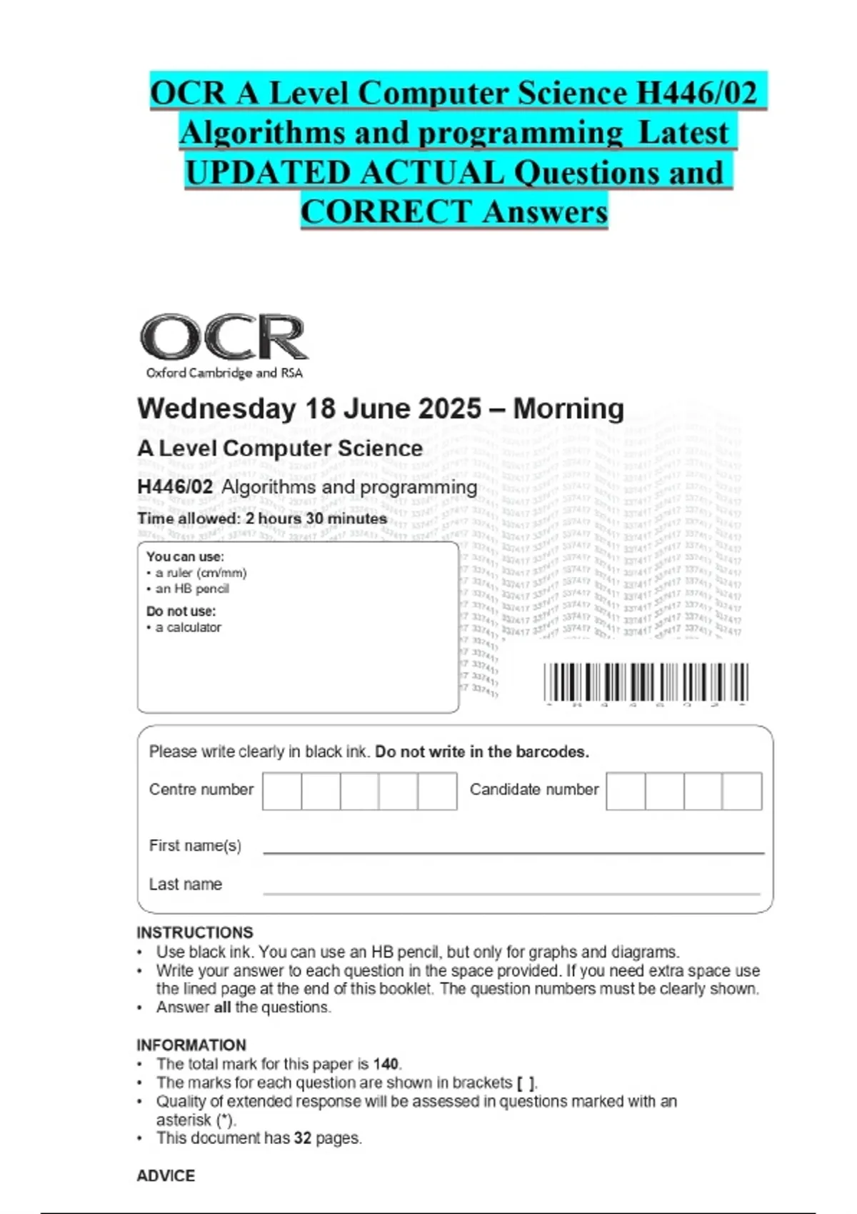 OCR A Level Computer Science H446/02 Algorithms and programming Latest UPDATED ACTUAL Questions and CORRECT Answers