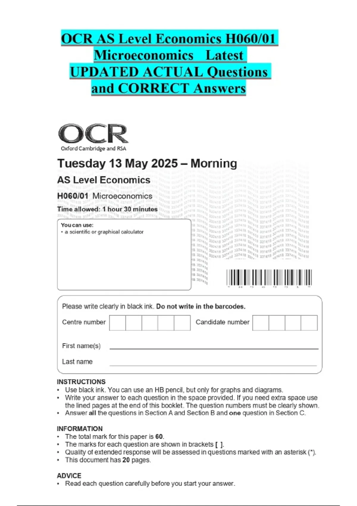 OCR AS Level Economics H060/01 Microeconomics Latest UPDATED ACTUAL Questions and CORRECT Answers