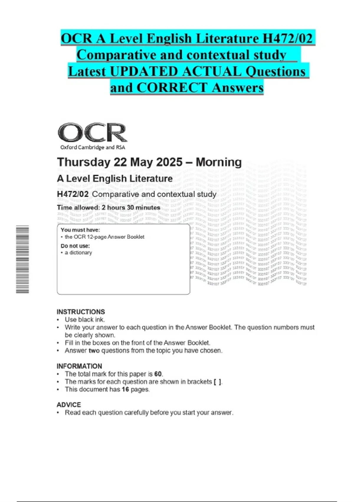 OCR A Level English Literature H472/02 Comparative and contextual study Latest UPDATED ACTUAL Questions and CORRECT Answers