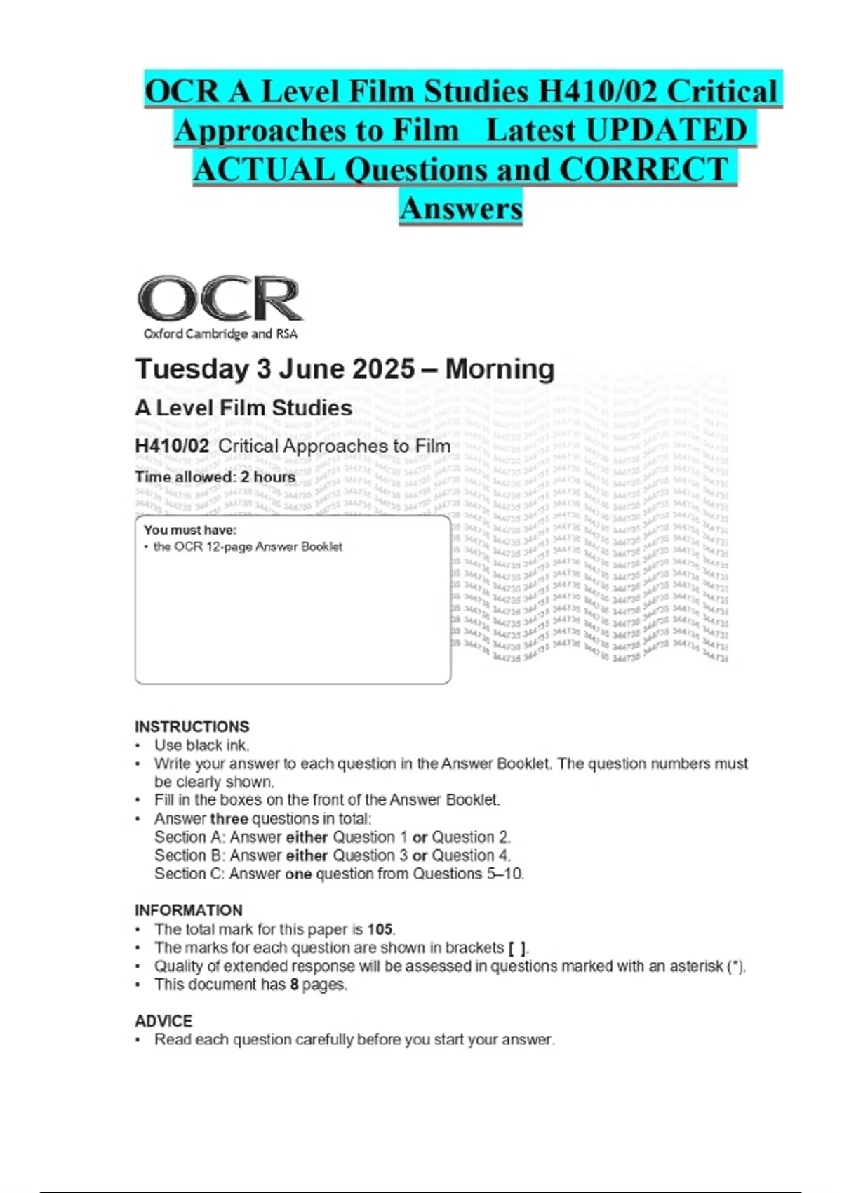 OCR A Level Film Studies H410/02 Critical Approaches to Film Latest UPDATED ACTUAL Questions and CORRECT Answers