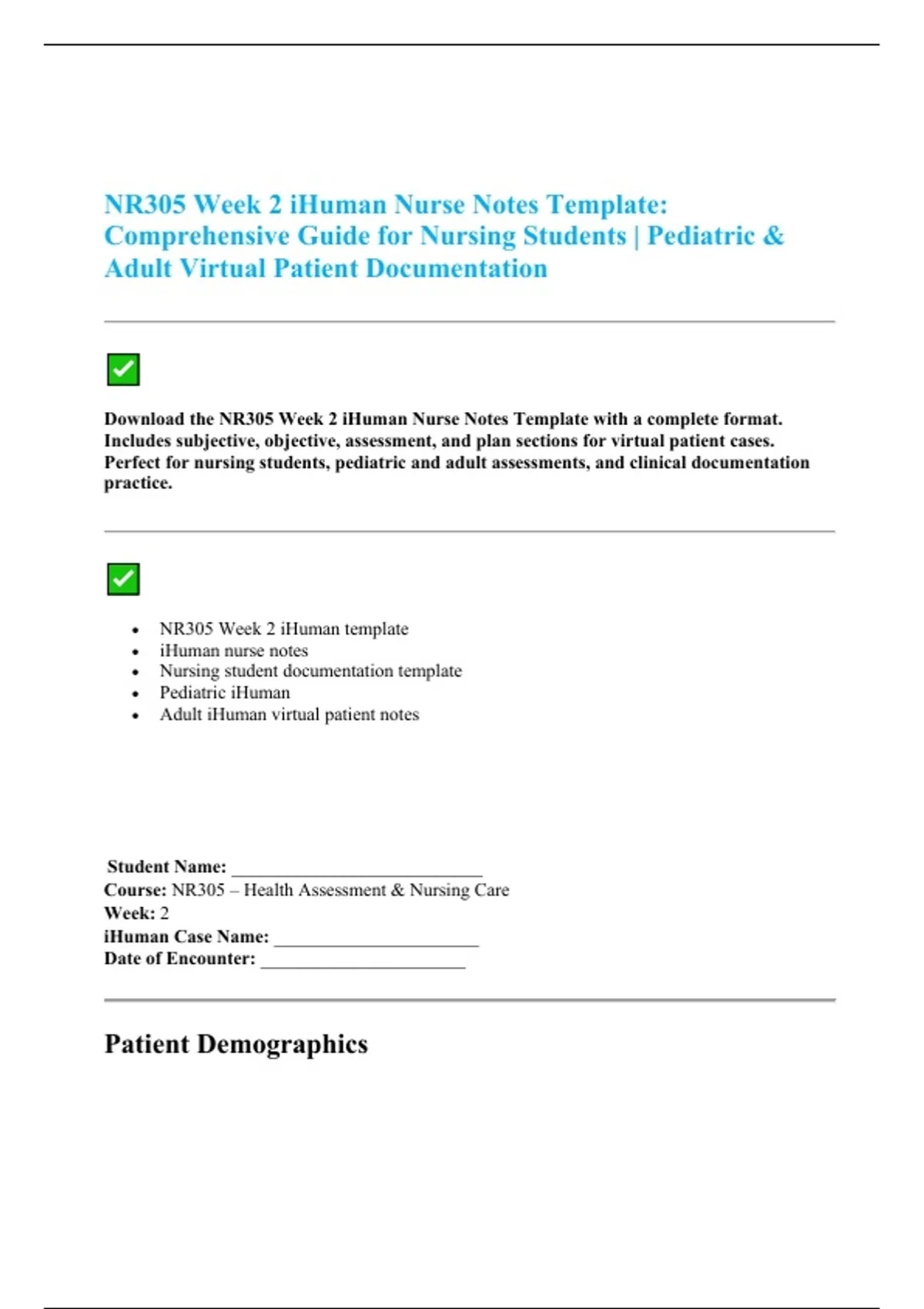 Download the NR305 Week 2 iHuman Nurse Notes Template with a complete format.