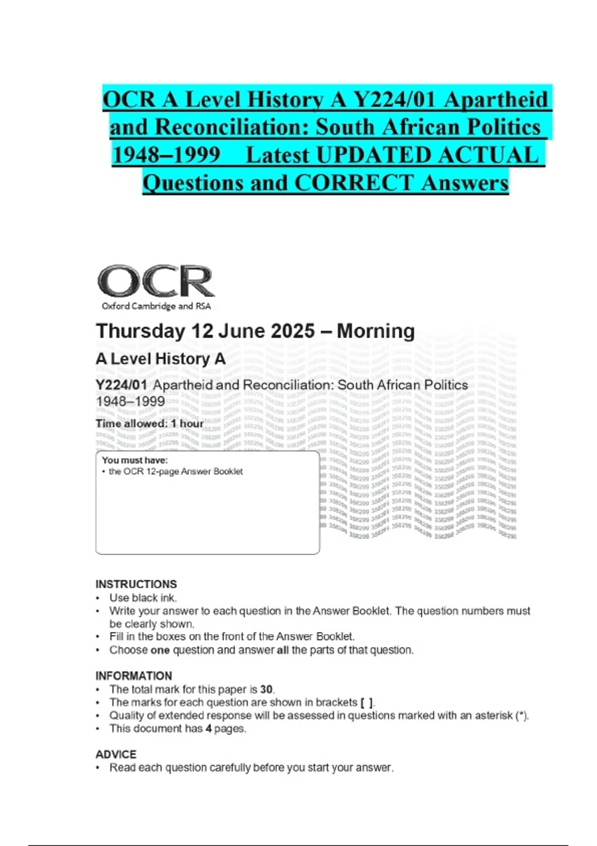 OCR A Level History A Y224/01 Apartheid and Reconciliation: South African Politics 1948–1999 Latest UPDATED ACTUAL Questions and CORRECT Answers