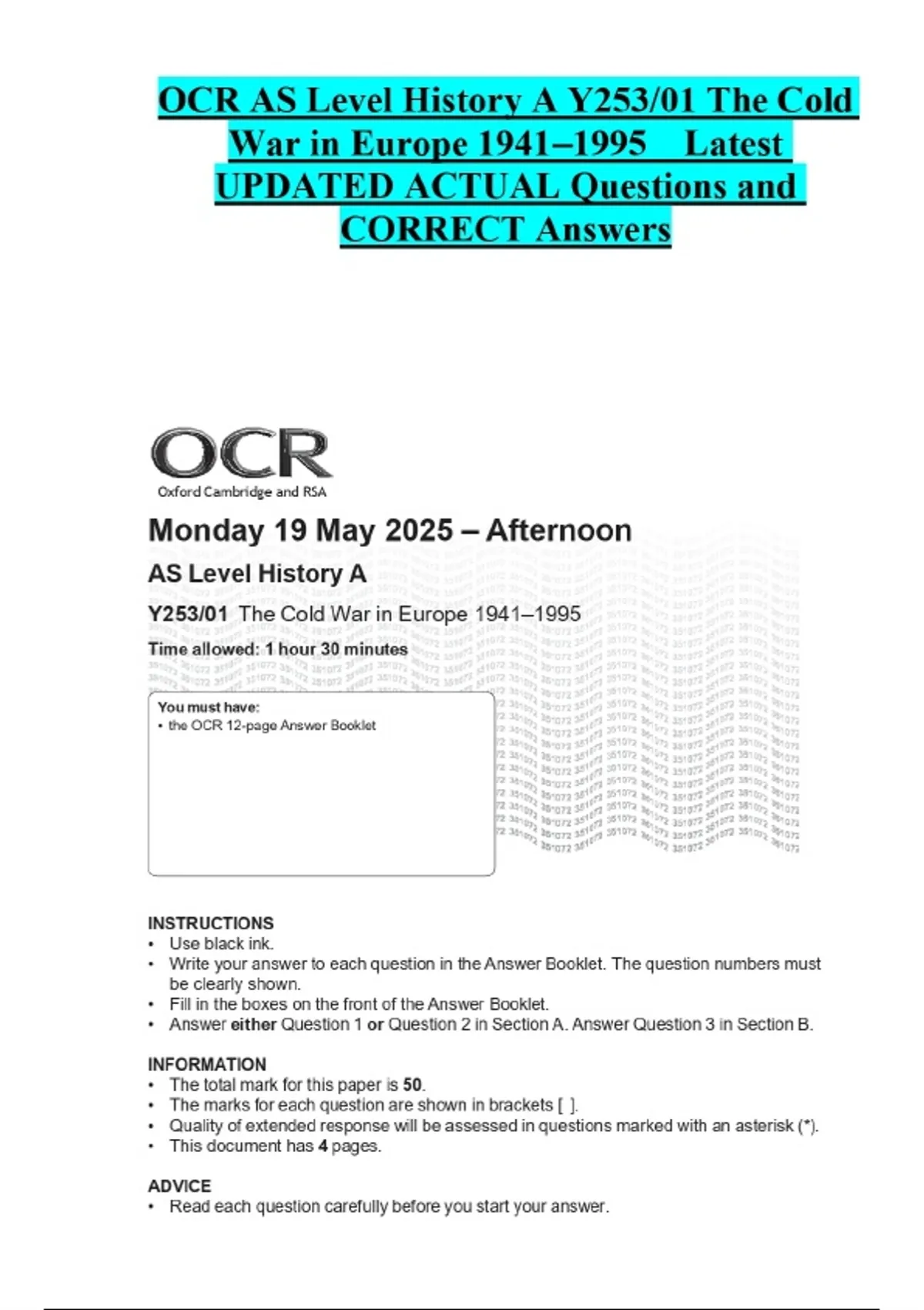 OCR AS Level History A Y253/01 The Cold War in Europe 1941–1995 Latest UPDATED ACTUAL Questions and CORRECT Answers