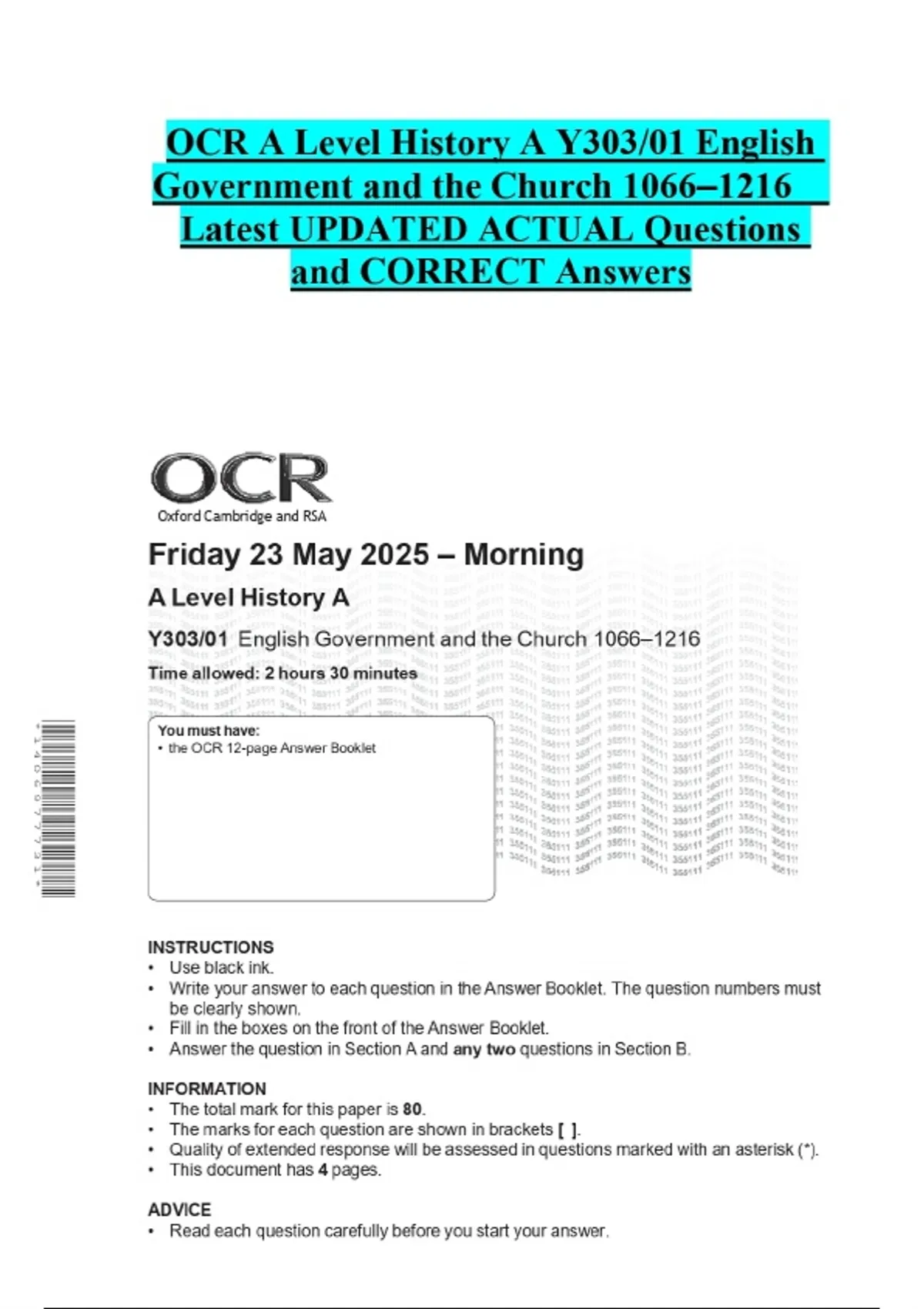 OCR A Level History A Y303/01 English Government and the Church 1066–1216 Latest UPDATED ACTUAL Questions and CORRECT Answers