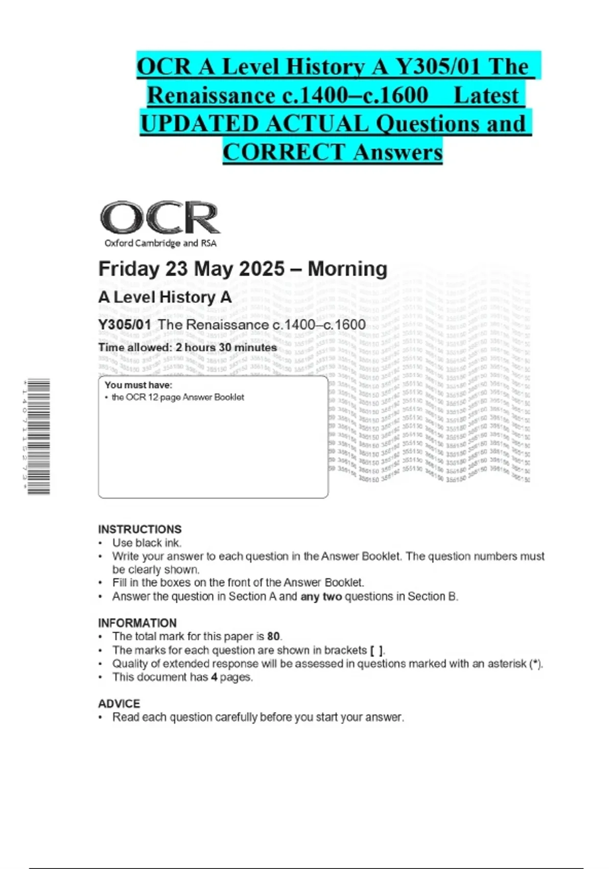 OCR A Level History A Y305/01 The Renaissance c.1400–c.1600 Latest UPDATED ACTUAL Questions and CORRECT Answers