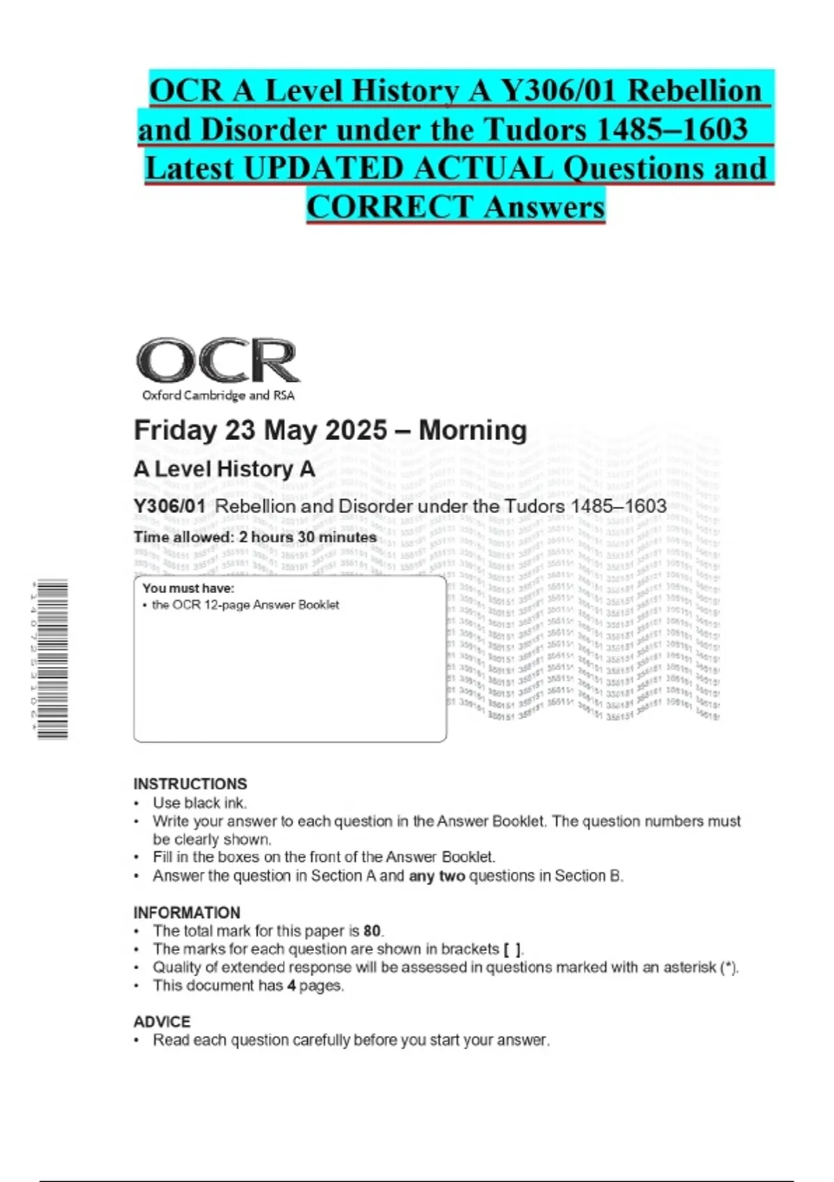 OCR A Level History A Y306/01 Rebellion and Disorder under the Tudors 1485–1603 Latest UPDATED ACTUAL Questions and CORRECT Answers