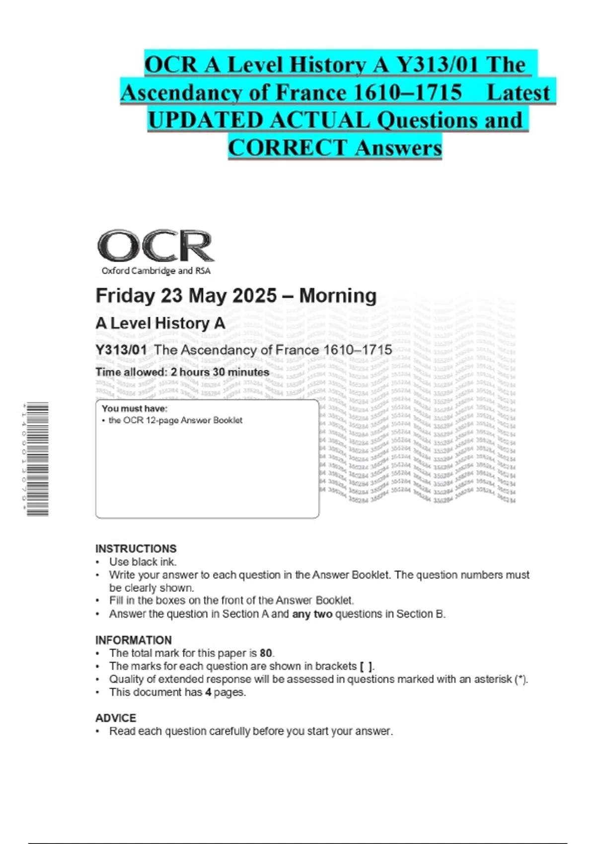 OCR A Level History A Y313/01 The Ascendancy of France 1610–1715 Latest UPDATED ACTUAL Questions and CORRECT Answers