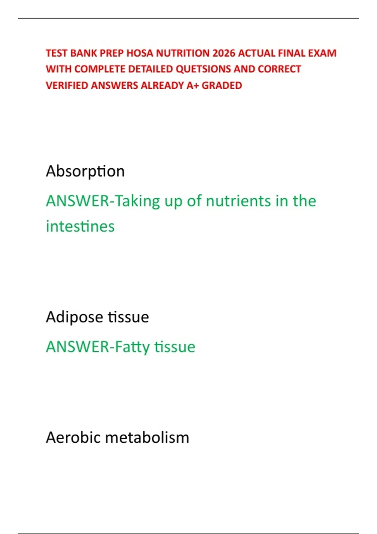 TEST BANK PREP HOSA NUTRITION 2026 ACTUAL FINAL EXAM